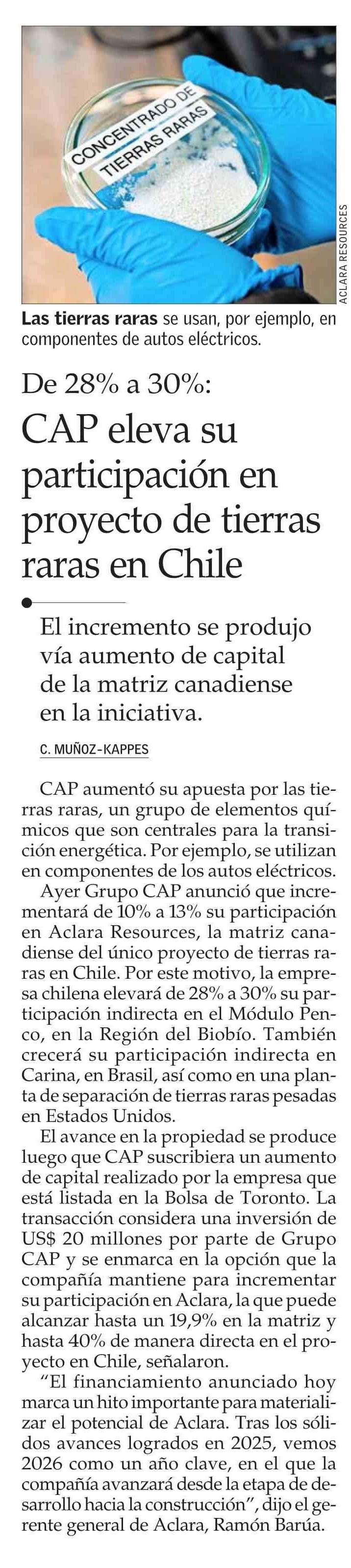 Título: CAP eleva su participación en proyecto de tierras raras en Chile