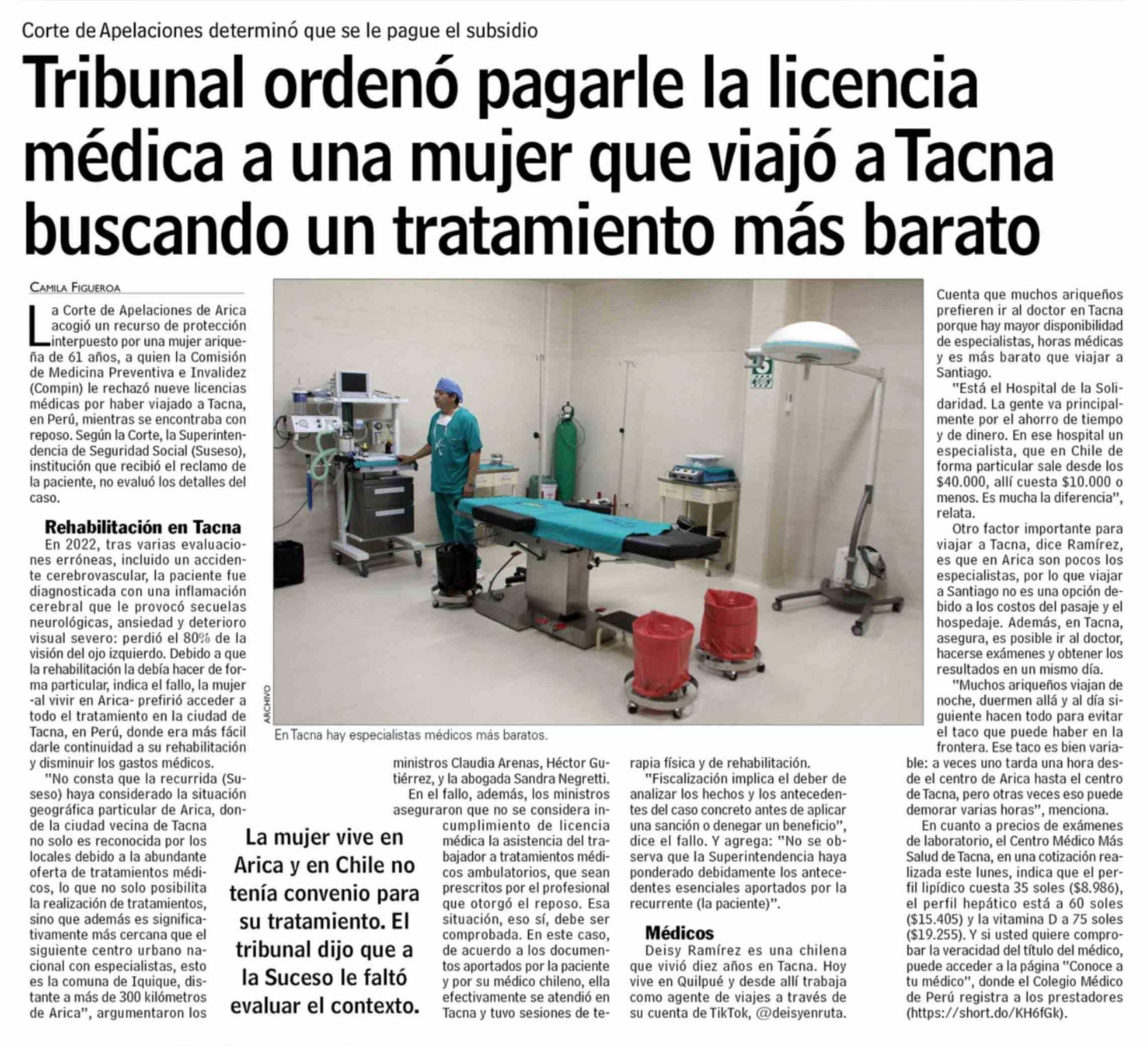 Título: Tribunal ordenó pagarle la licencia médica a una mujer que viajó a Tacna buscando un tratamiento más barato