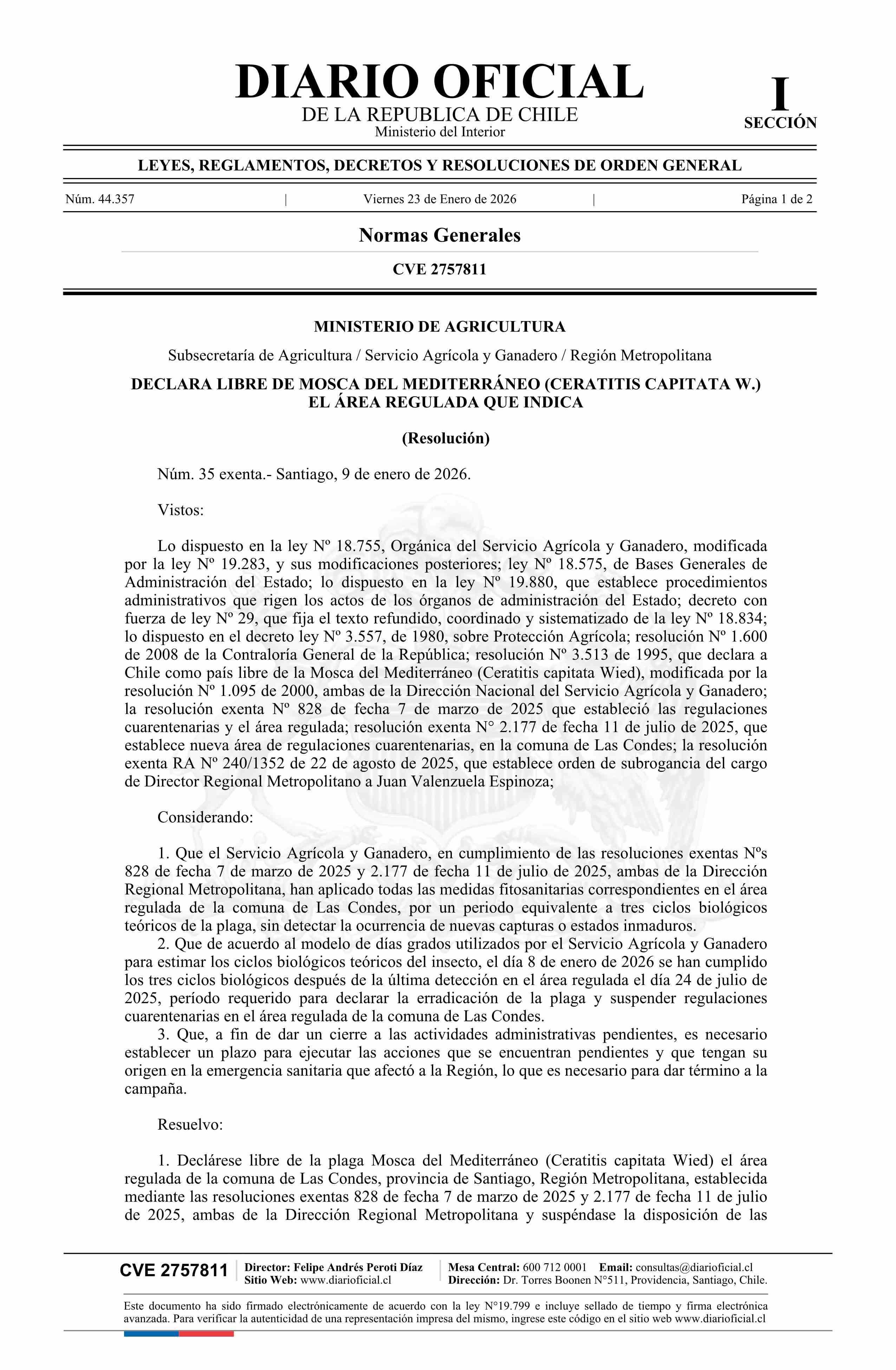 Título: Resolución exenta número 35, de 2026.- Declara libre de Mosca del Mediterráneo (Ceratitis capitata W.) el área regulada que indica