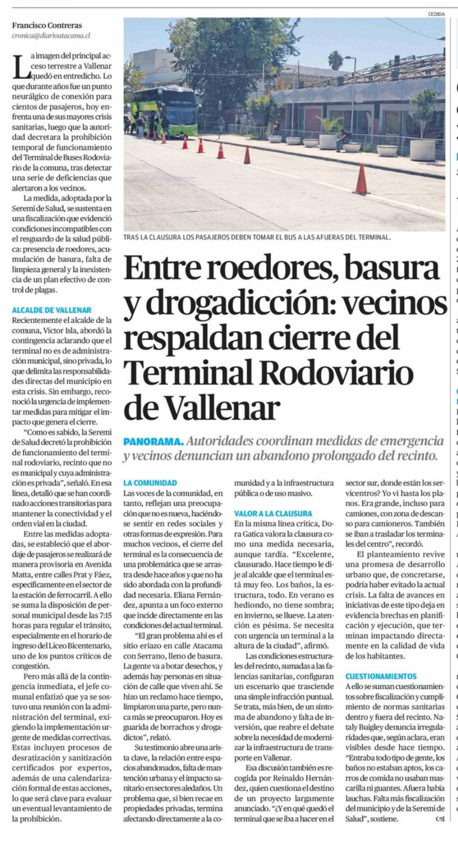 Entre roedores, basura y drogadicción: vecinos respaldan cierre del Terminal Rodoviario de Vallenar 26-03-2026 El Diario de Atacama |
