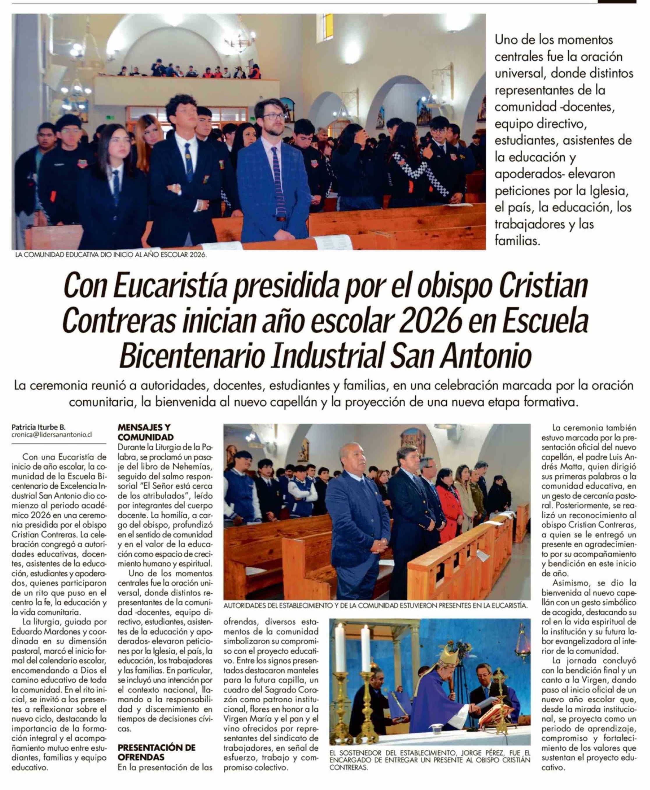 Con Eucaristía presidida por el obispo Cristian Contreras inician año escolar 2026 en Escuela Bicentenario Industrial San Antonio 25-03-2026 El Líder |