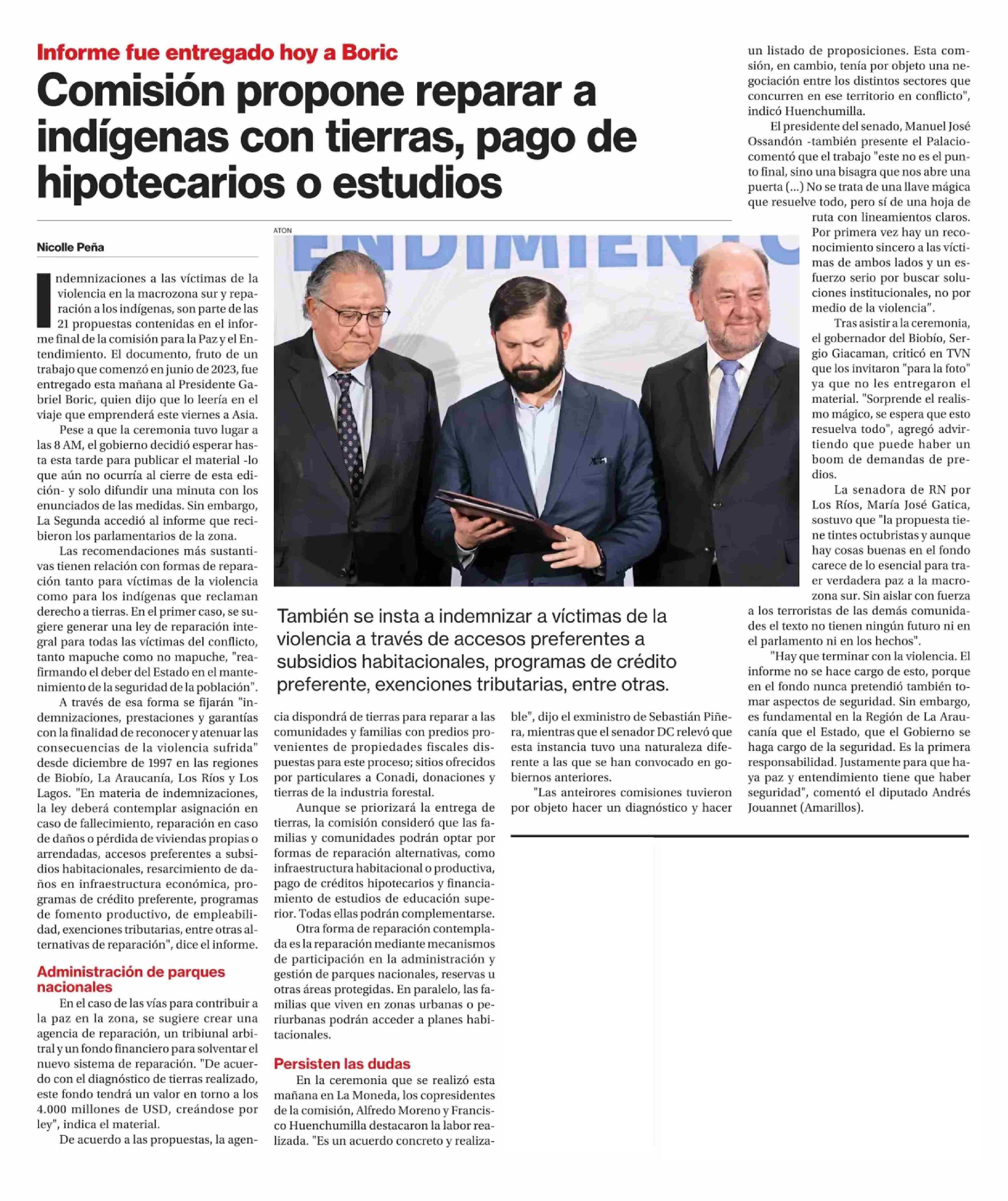 Comisión propone reparar a indígenas con tierras, pago de hipotecarios o estudios 06-05-2025 La Segunda |