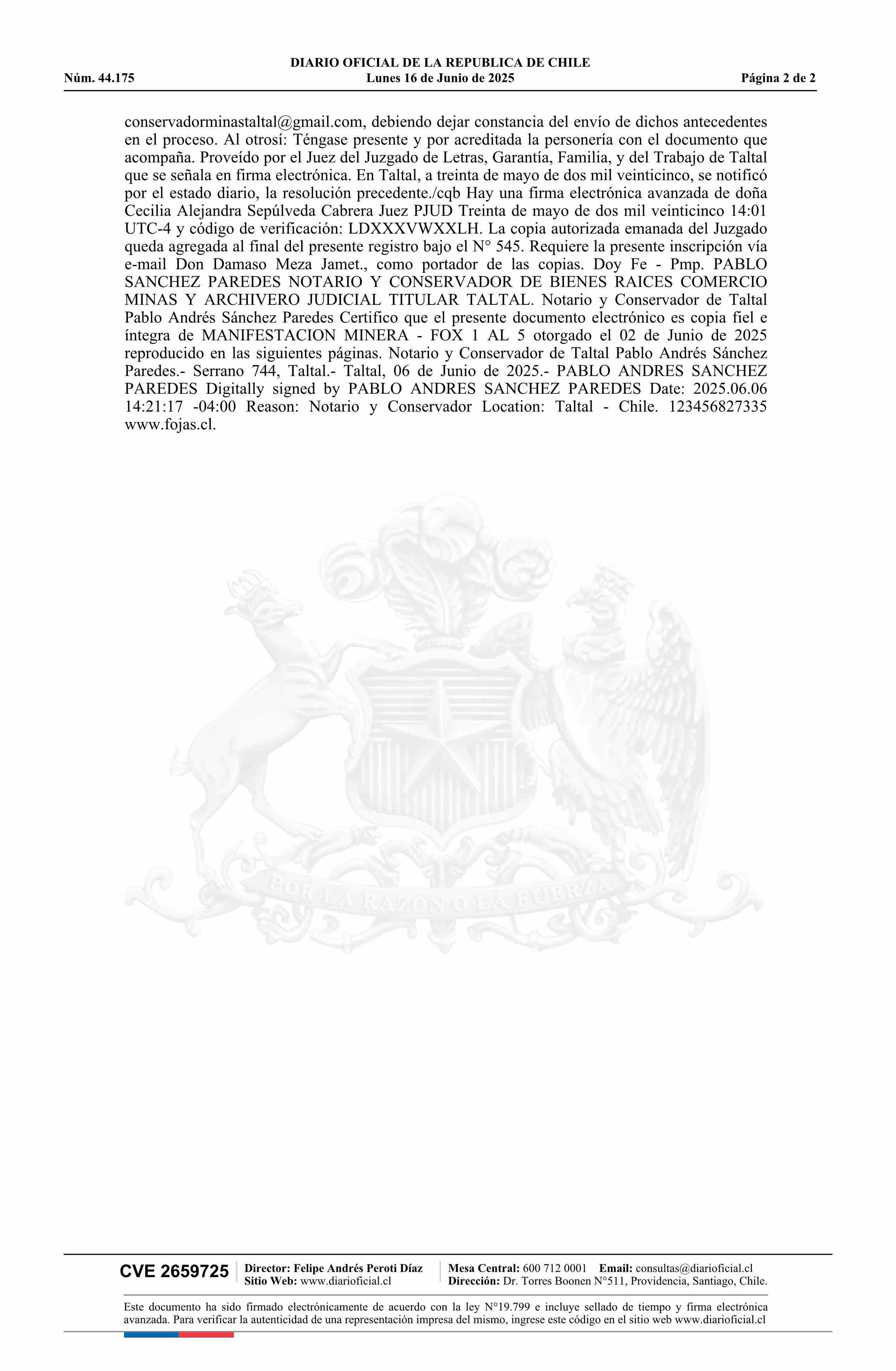 FOX 1 AL 5 / SLM Río Blanco Primera de la Comuna de Taltal 16-06-2025 DIARIO OFICIAL CHILE - BOLETÍN OFICIAL DE MINERÍA |