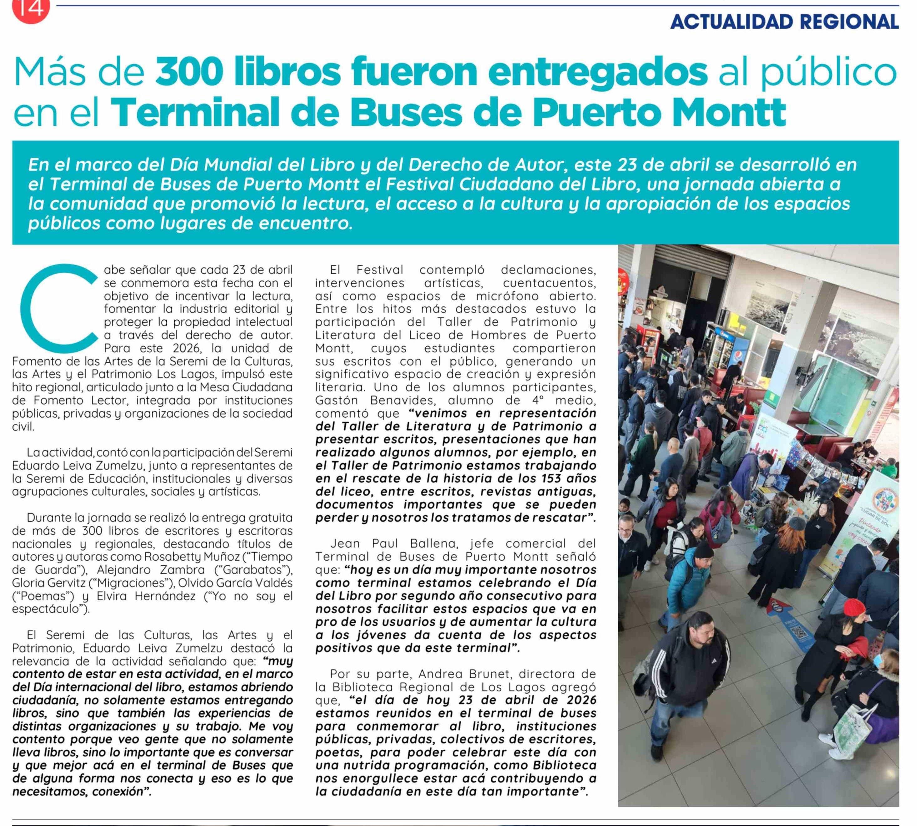 Más de 300 libros fueron entregados al público en el Terminal de Buses de Puerto Montt 24-04-2026 El Insular |
