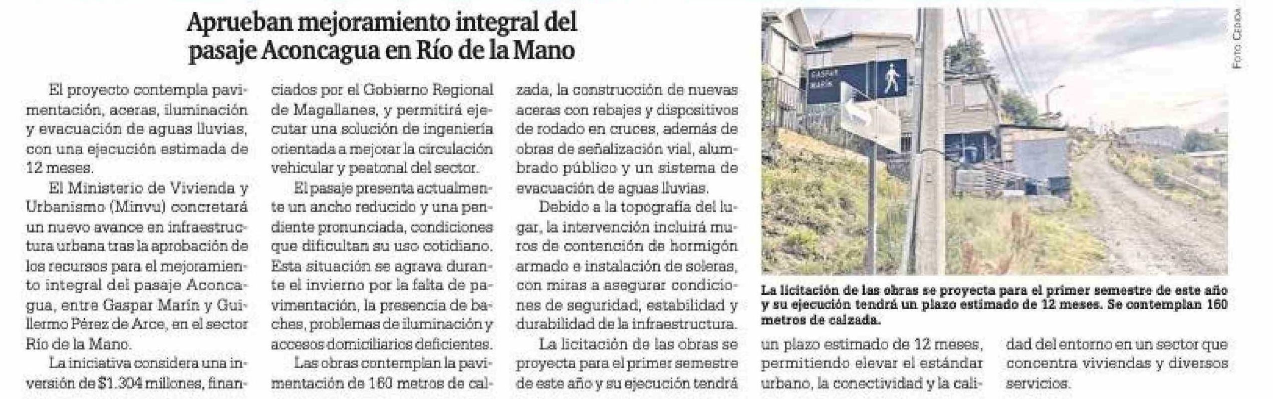 Aprueban mejoramiento integral del pasaje Aconcagua en Río de la Mano 16-02-2026 La Prensa Austral |