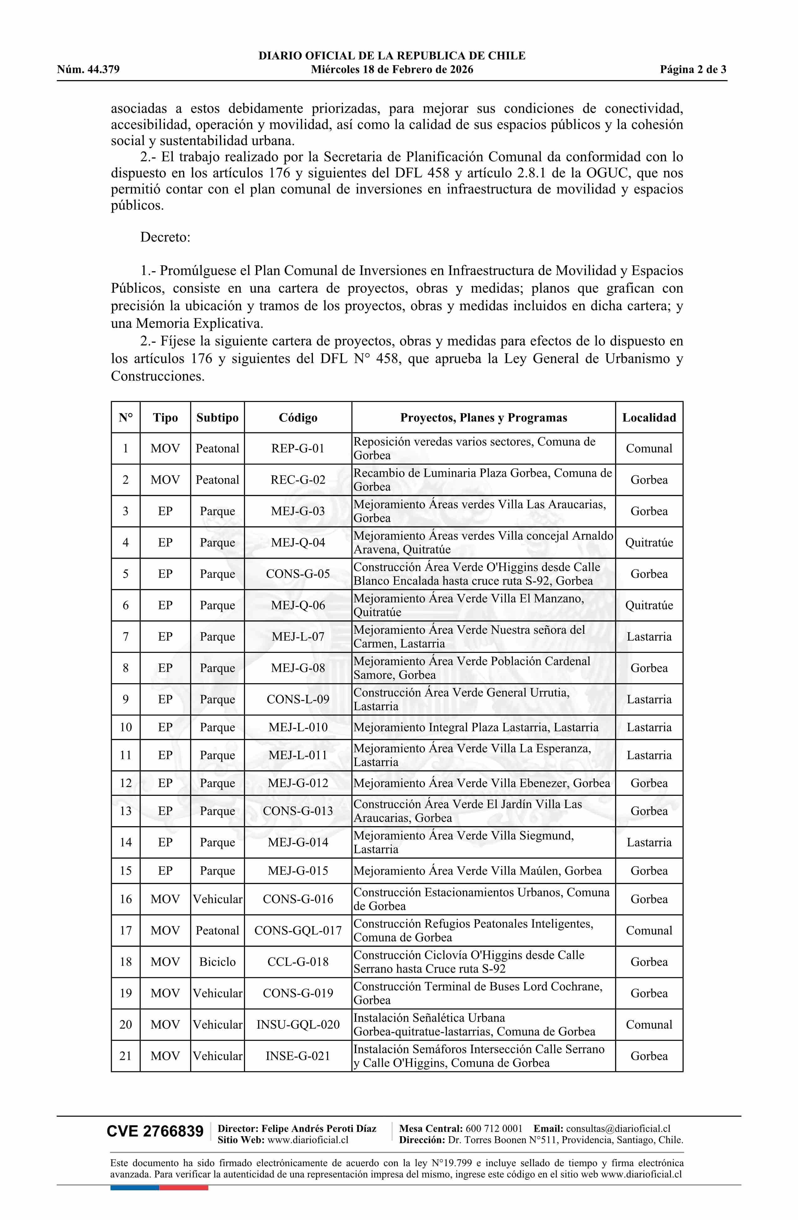 Decreto alcaldicio exento número 159, de 2026.- Promulga Plan Comunal de Inversiones en Infraestructura de Movilidad y Espacio Público de Gorbea