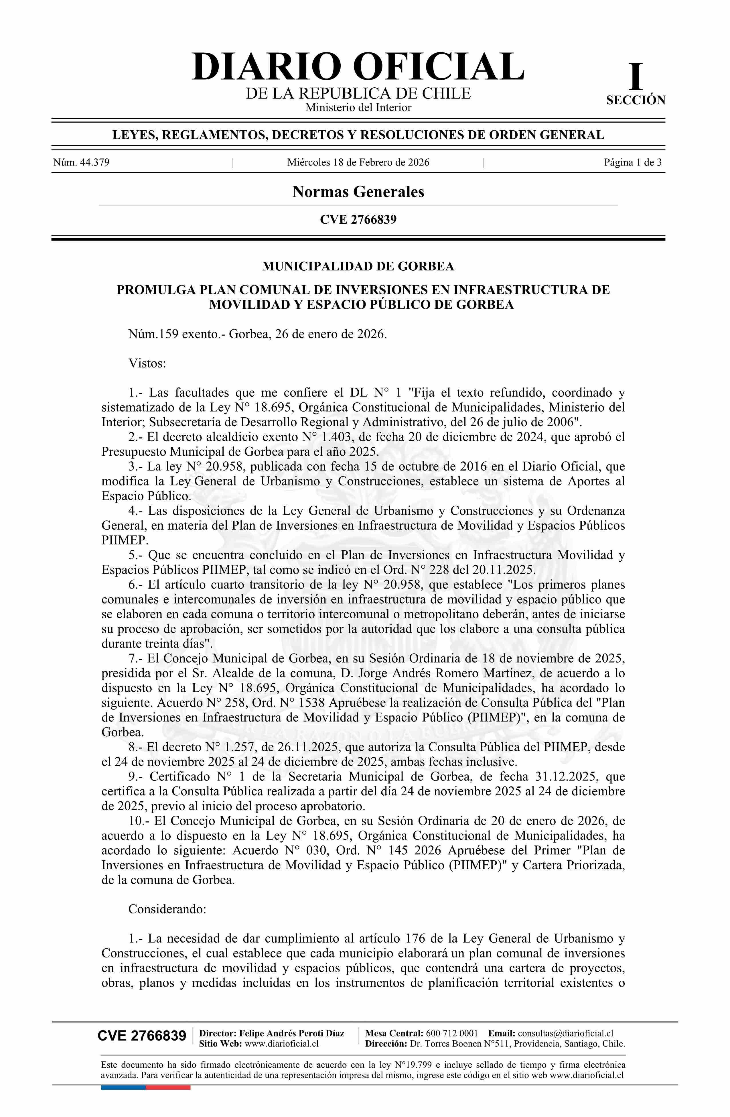 Título: Decreto alcaldicio exento número 159, de 2026.- Promulga Plan Comunal de Inversiones en Infraestructura de Movilidad y Espacio Público de Gorbea