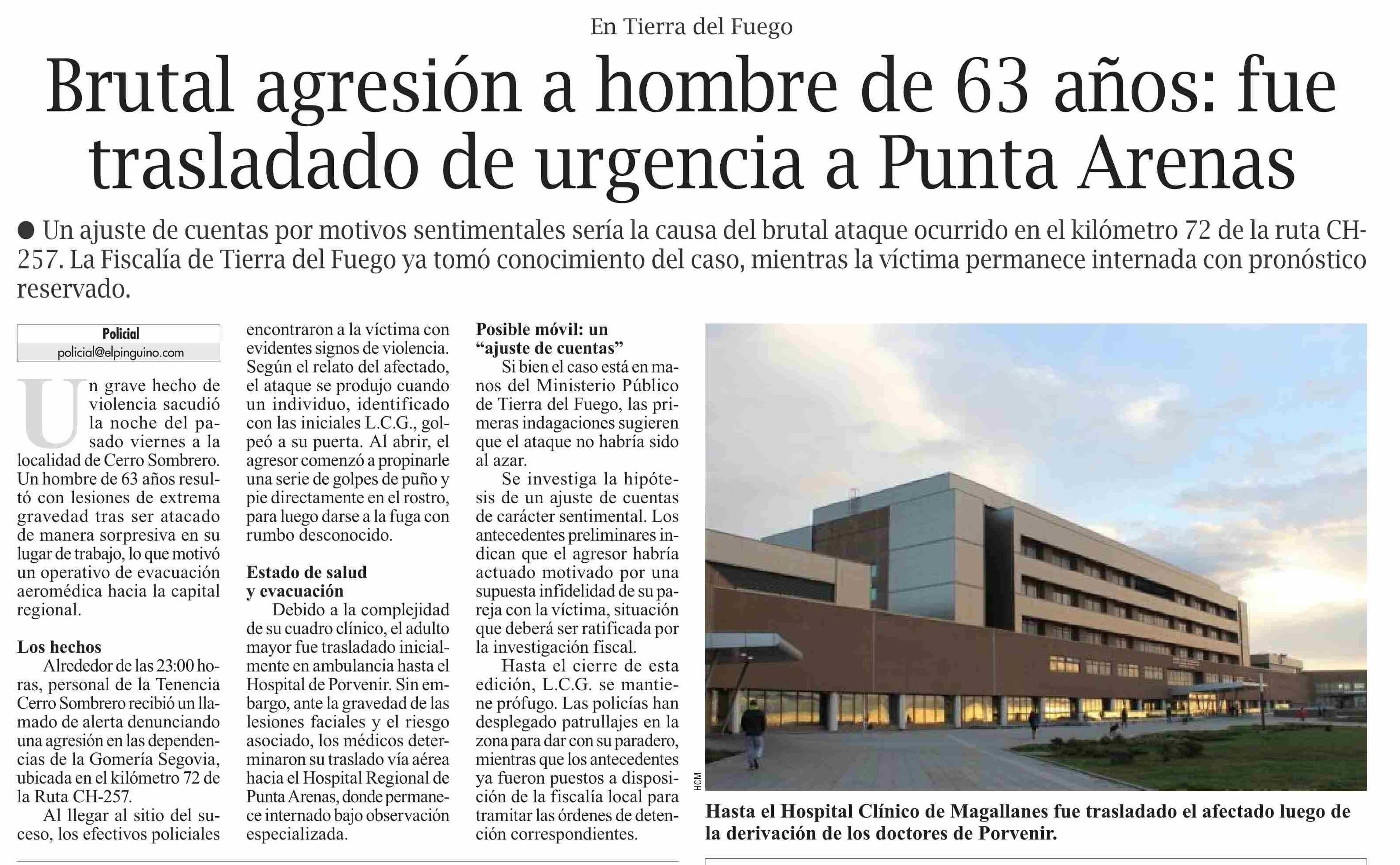 | Título: | Brutal agresión a hombre de 63 años: fue trasladado de urgencia a Punta Arenas |