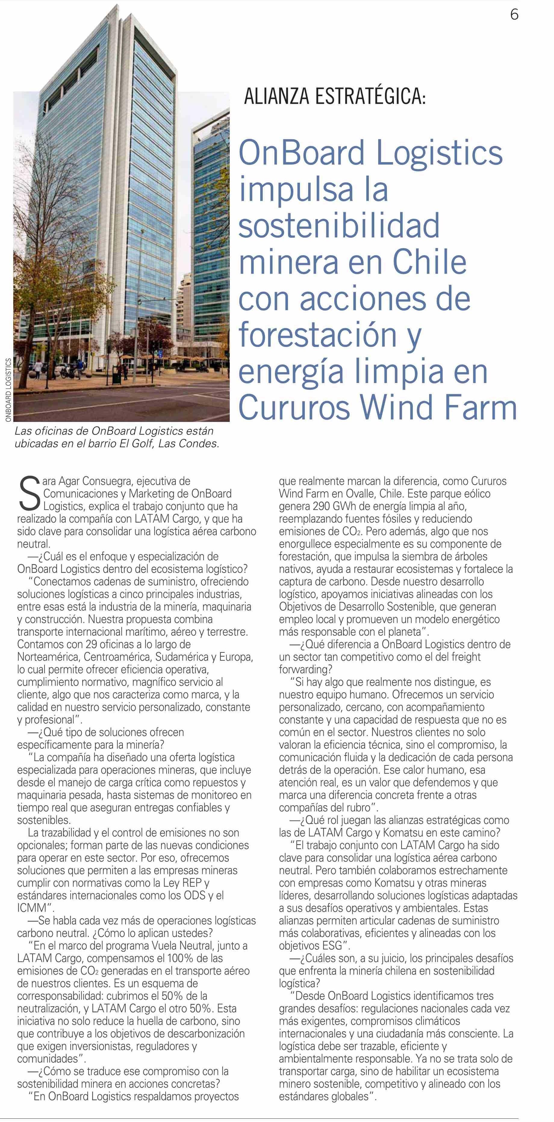 OnBoard Logistics impulsa la sostenibilidad minera en Chile con acciones de forestación y energía limpia en Cururos Wind Farm 22-05-2025 El Mercurio |