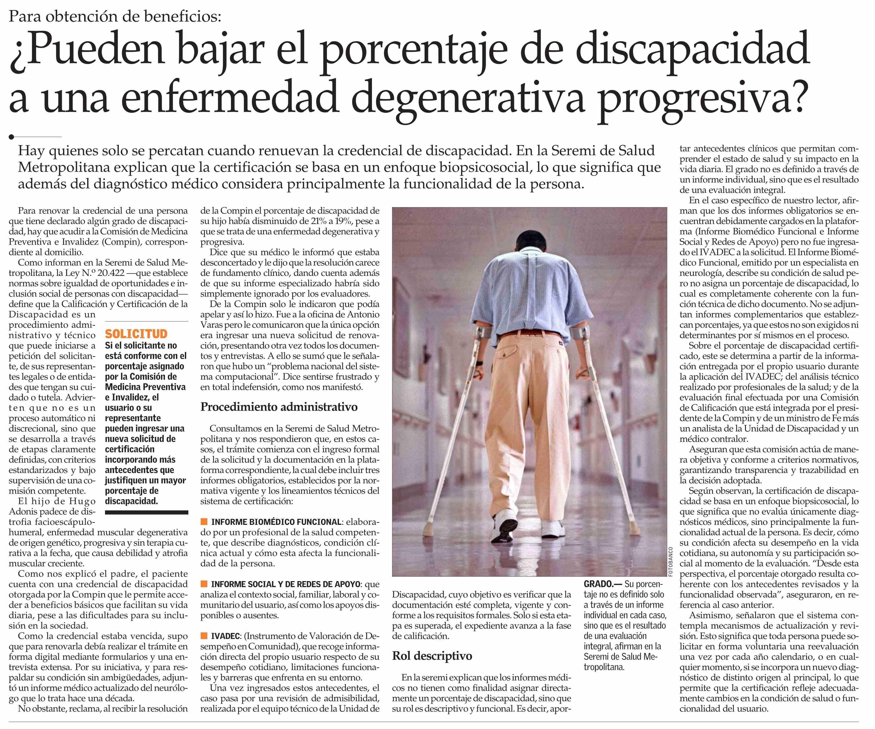 ¿Pueden bajar el porcentaje de discapacidad a una enfermedad degenerativa progresiva? 12-04-2026 El Mercurio |