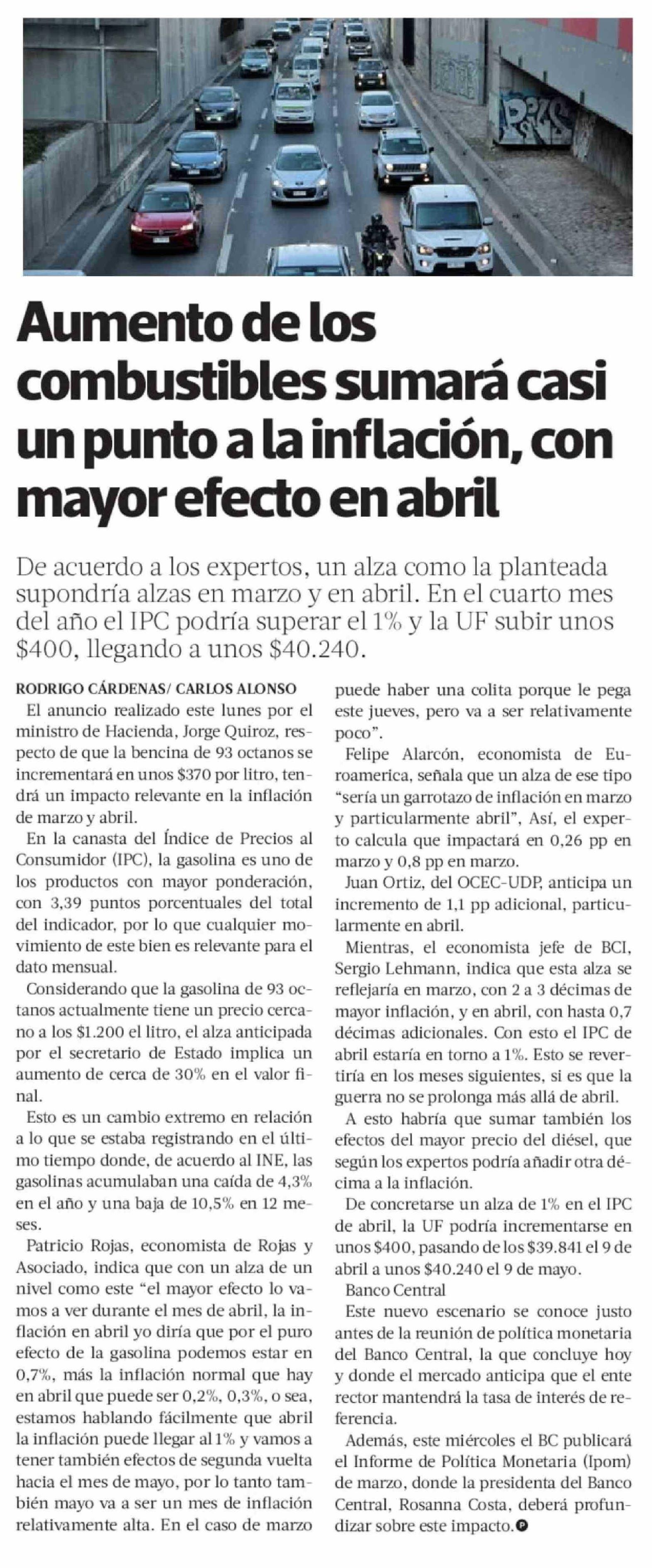 Aumento de los combustibles sumará casi un punto a la inflación, con mayor efecto en abril 24-03-2026 La Tercera |