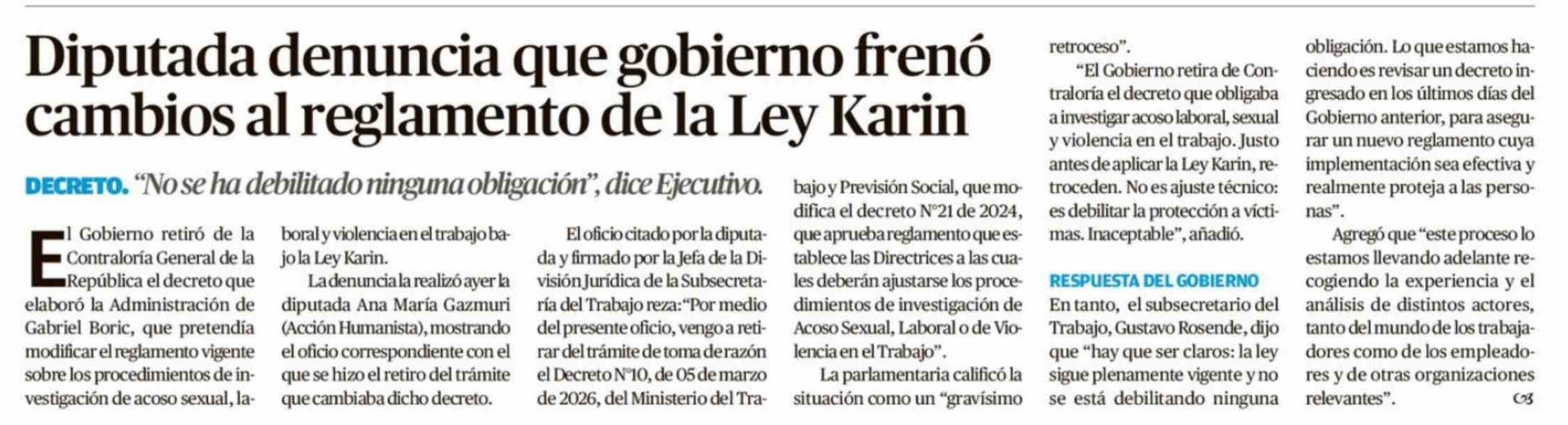 Diputada denuncia que gobierno frenó cambios al reglamento de la Ley Karin 05-04-2026 El Mercurio de Valparaíso |