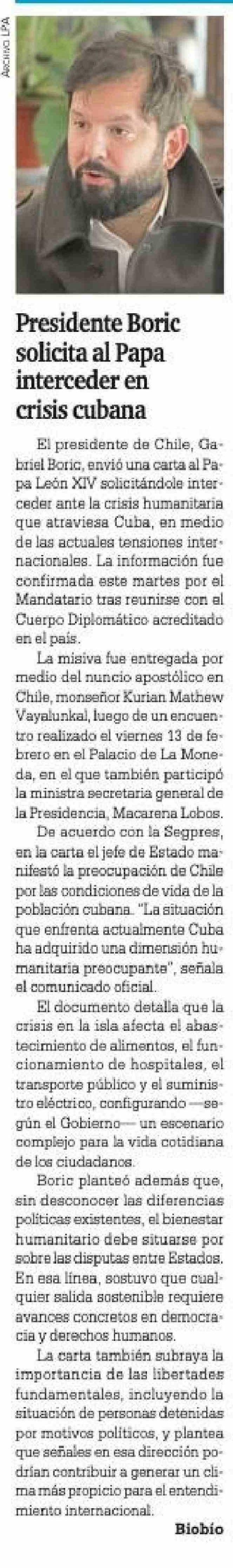 Presidente Boric solicita al Papa interceder en crisis cubana 18-02-2026 La Prensa Austral |
