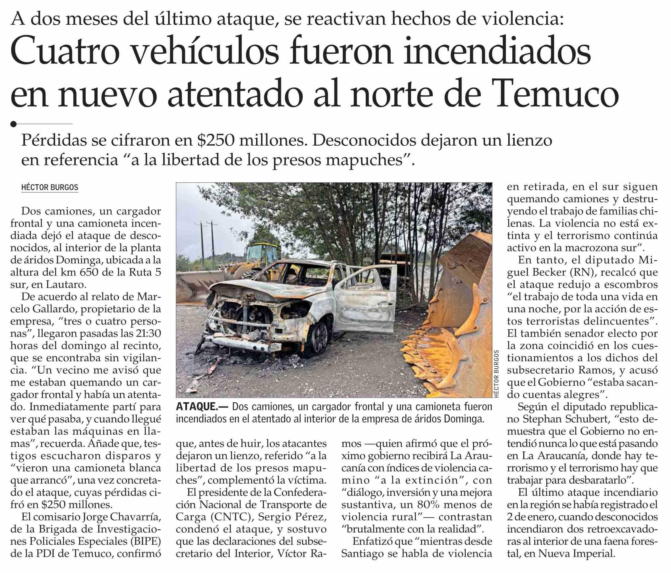 Título: Cuatro vehículos fueron incendiados en nuevo atentado al norte de Temuco