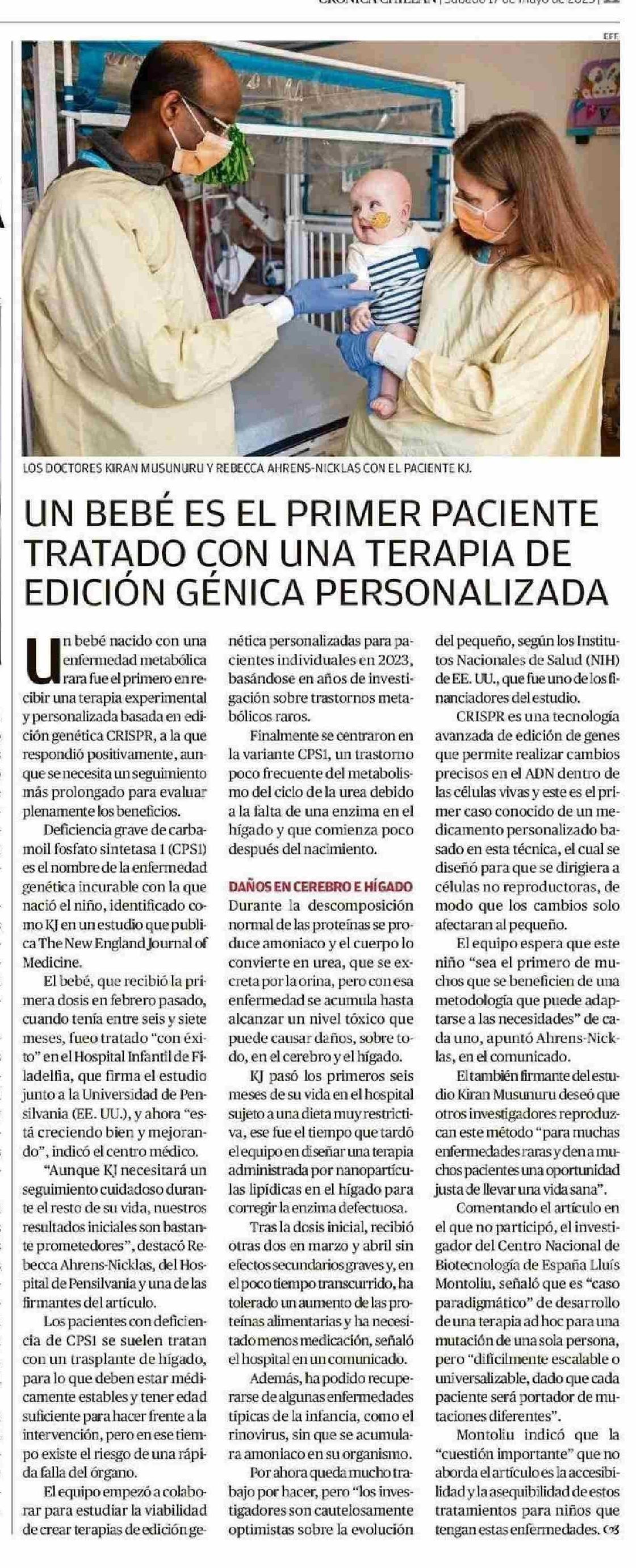 | Título: | UN BEBÉ ES EL PRIMER PACIENTE TRATADO CON UNA TERAPIA DE EDICIÓN GÉNICA PERSONALIZADA |
