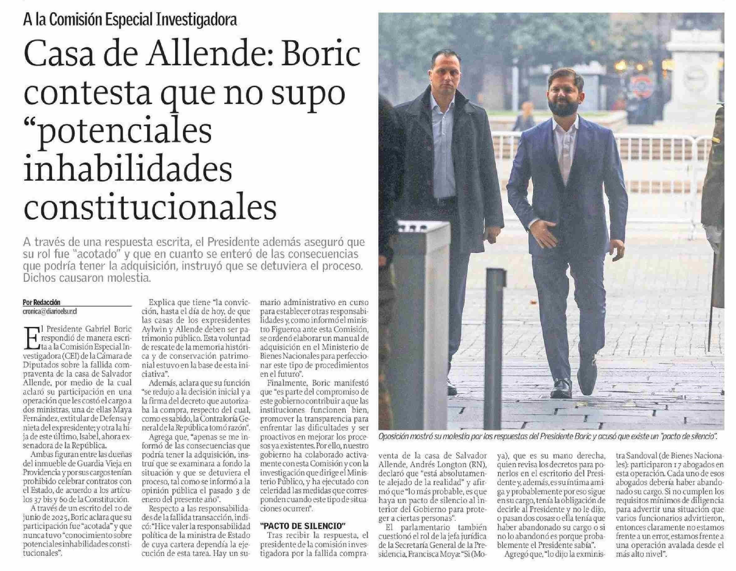 Casa de Allende: Boric contesta que no supo “potenciales inhabilidades constitucionales 12-06-2025 El Sur |