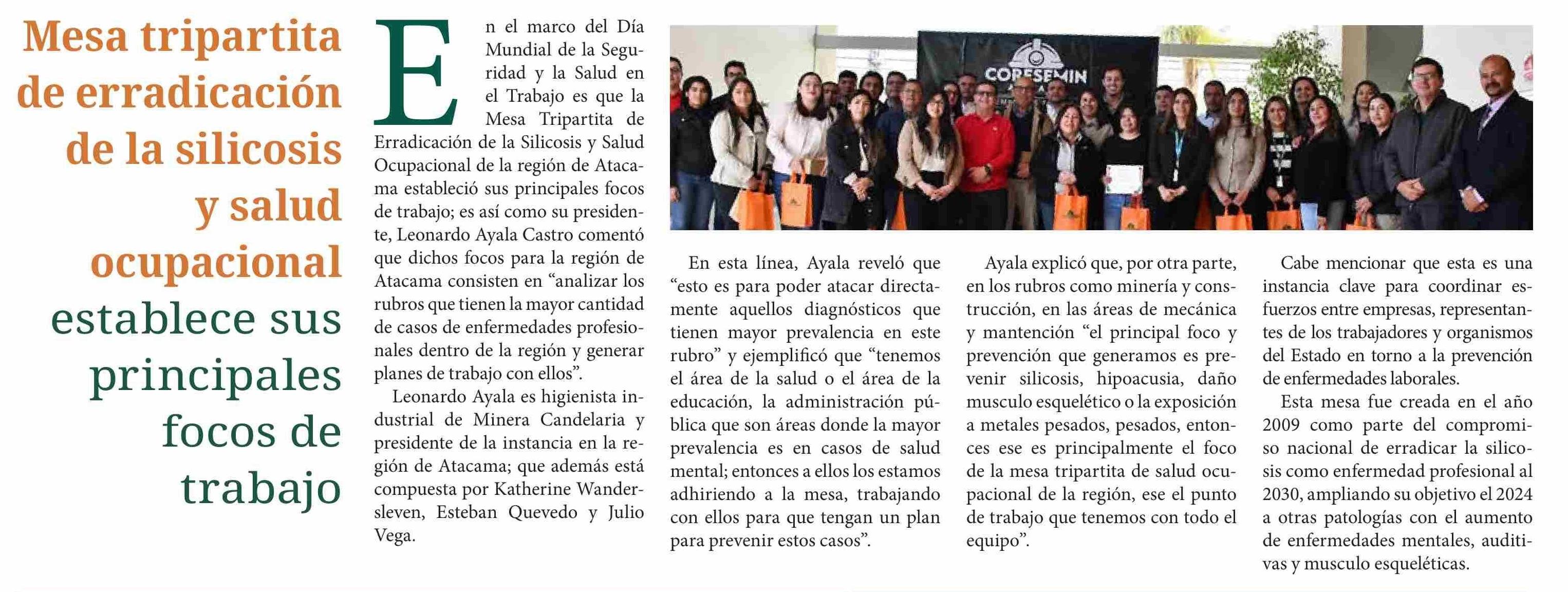 | Título: | En el marco del Día Mundial de la Seguridad y la Salud en el Trabajo es que la Mesa Tripartita de Erradicación de la Silicosis y Salud Ocupacional de la región de Atacama estableció sus principales focos de trabajo; es así como su presidente, Leonardo Ayala Castro comentó que dichos focos para la re |