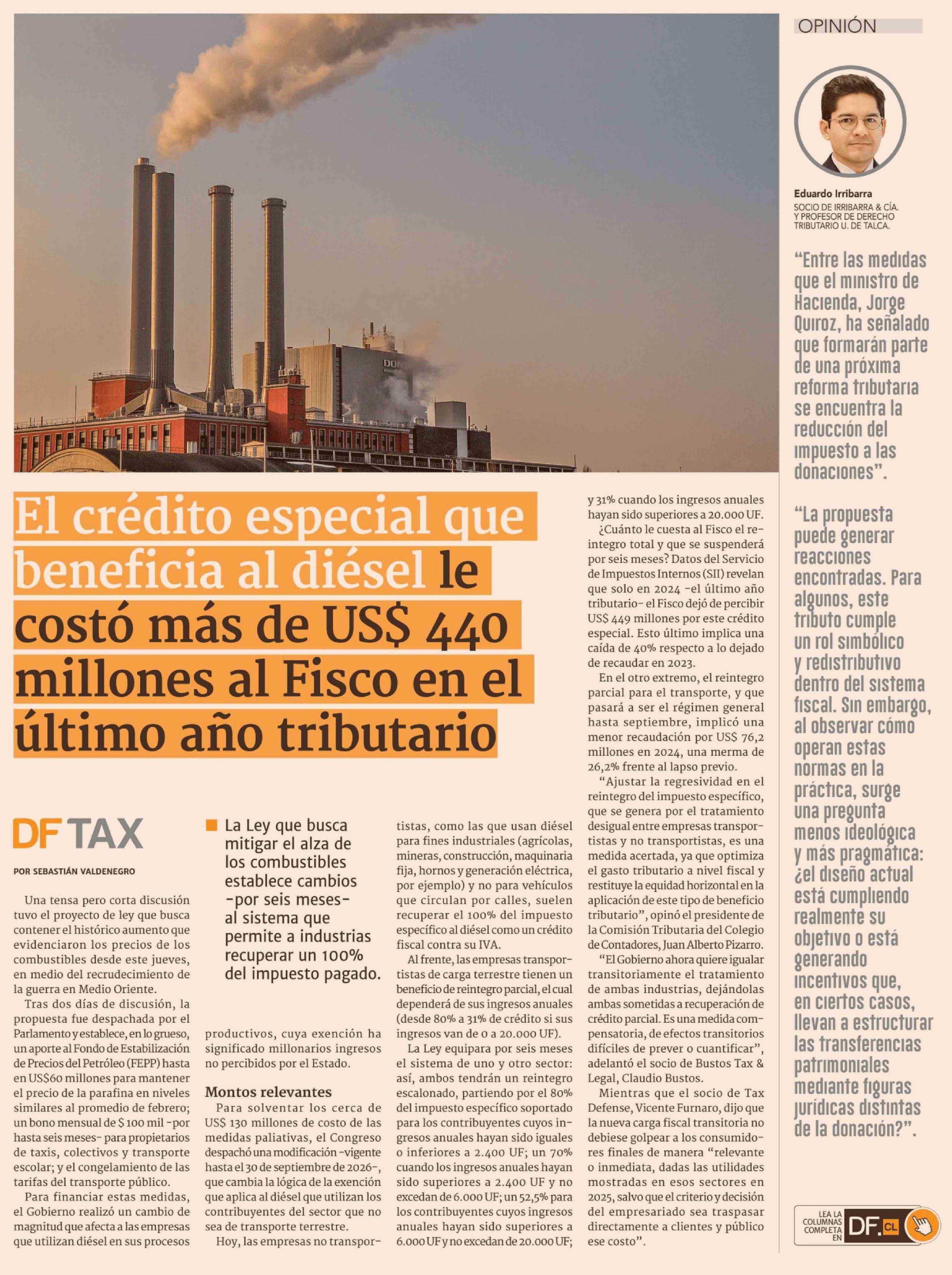 El crédito especial que beneficia al diésel le costó más de US$ 440 millones al Fisco en el último año tributario 27-03-2026 Diario Financiero |