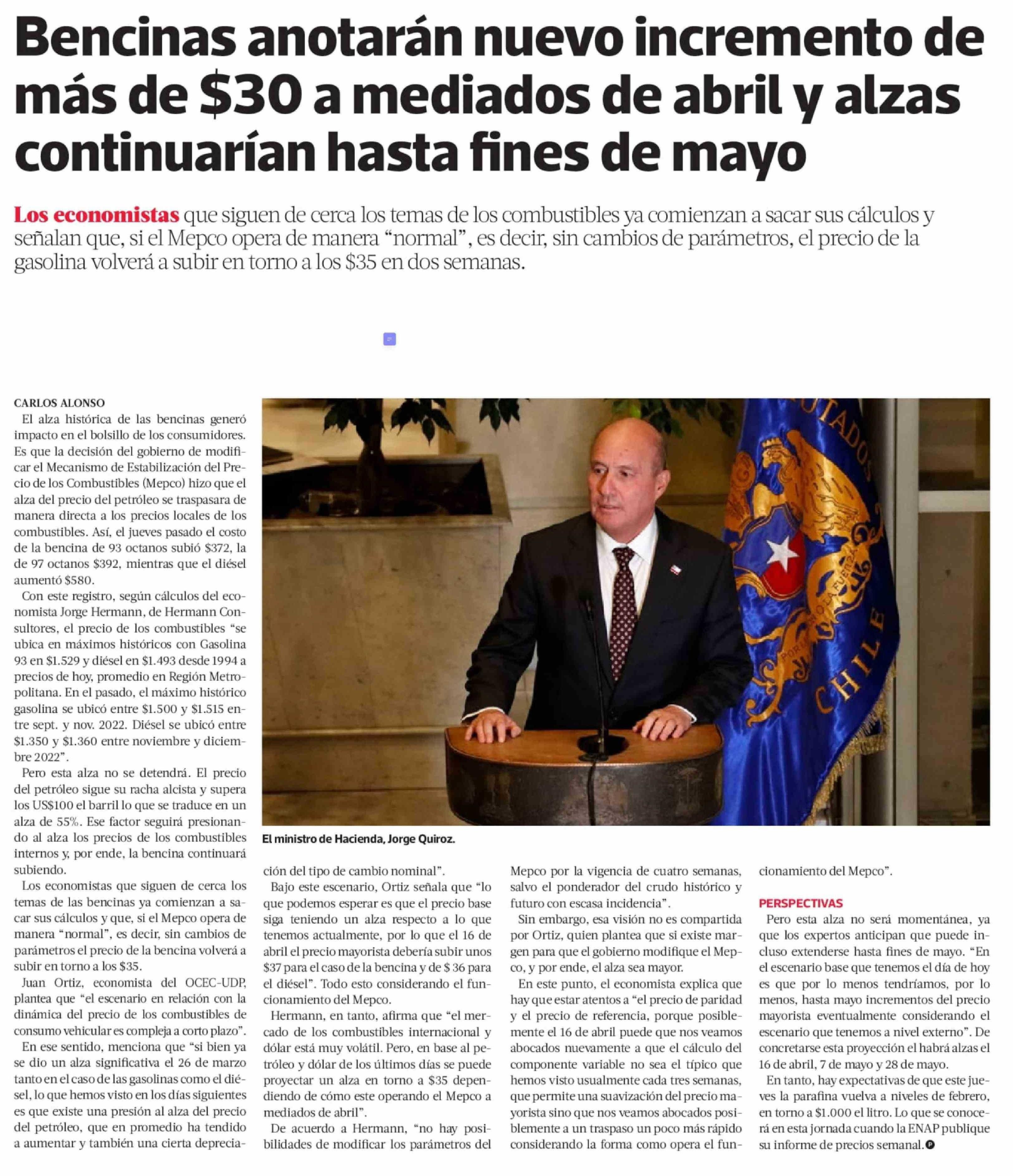 Título: Bencinas anotarán nuevo incremento de más de $30 a mediados de abril y alzas continuarían hasta fines de mayo
