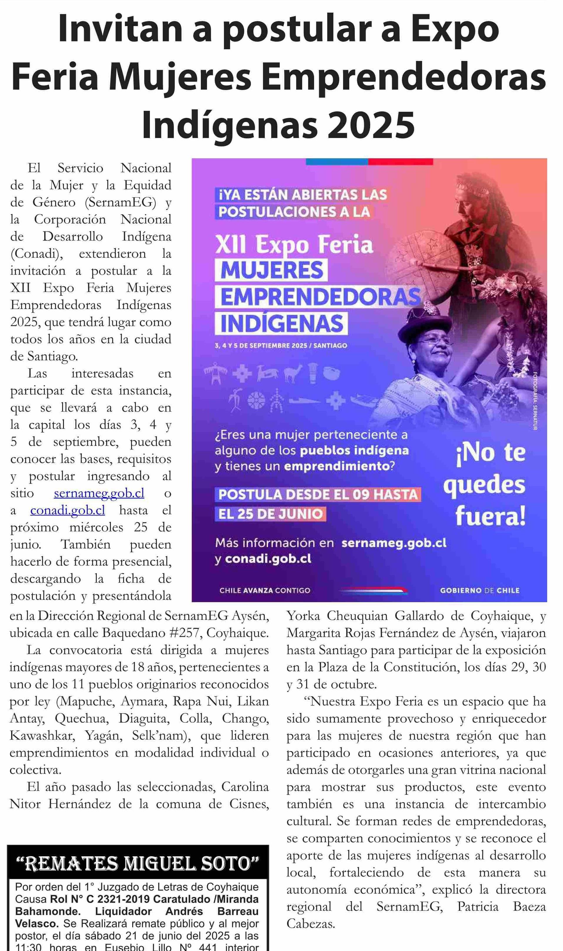 | Título: | Invitan a postular a Expo Feria Mujeres Emprendedoras Indígenas 2025 |