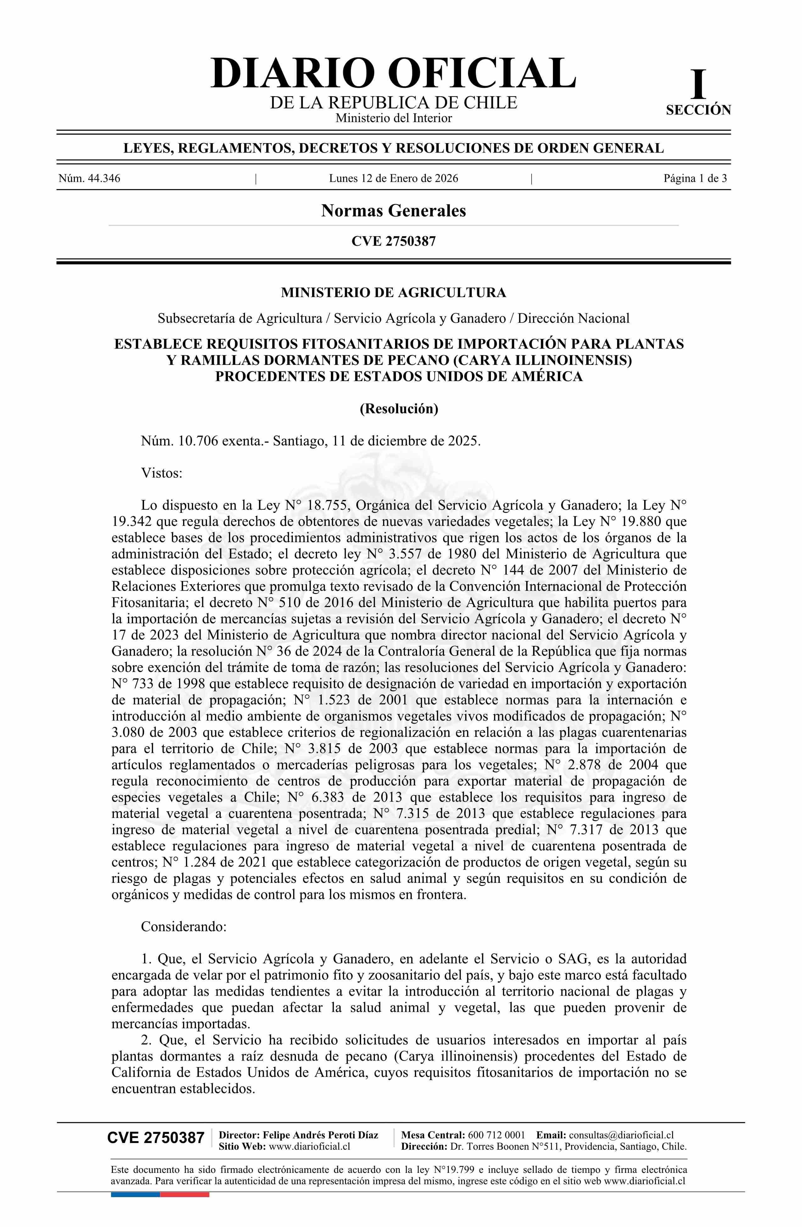 | Título: | Resolución exenta número 10.706, de 2025.- Establece requisitos fitosanitarios de importación para plantas y ramillas dormantes de pecano (carya illinoinensis) procedentes de Estados Unidos de América |