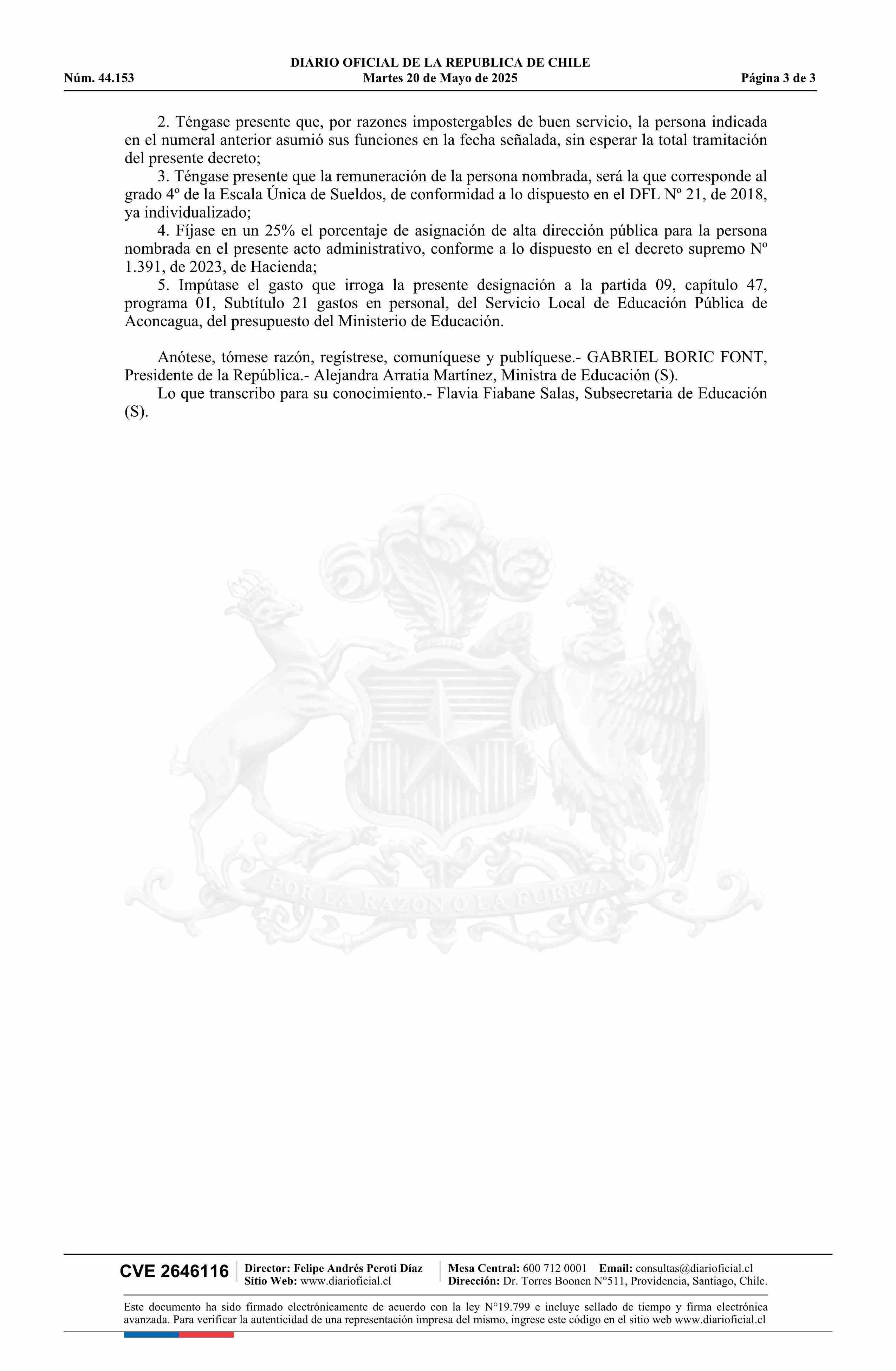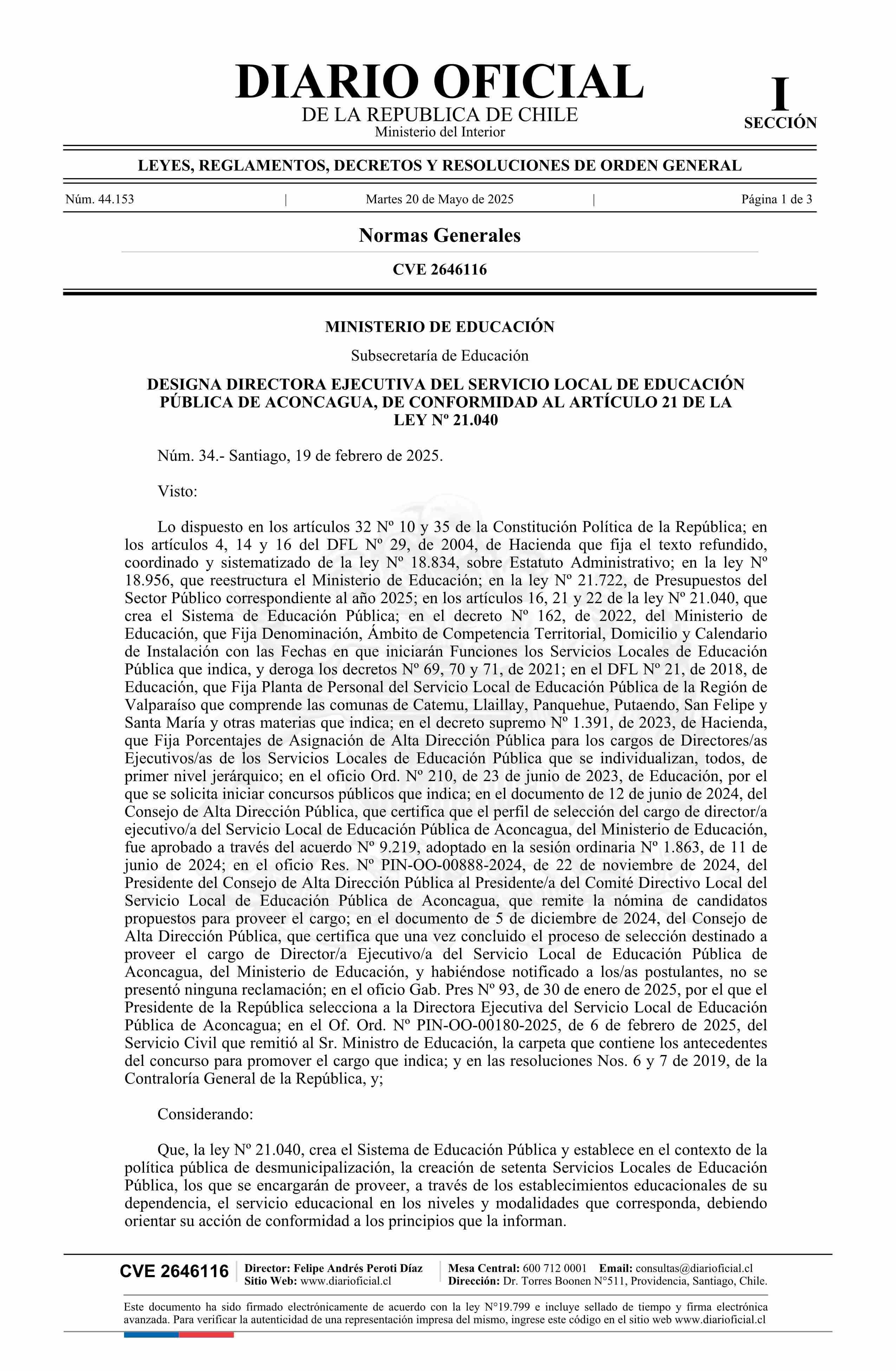 | Título: | Decreto número 34, de 2025.- Designa a doña Carmen Gloria Martínez Retamal como Directora Ejecutiva del Servicio Local de Educación Pública de Aconcagua, de conformidad al artículo 21 de la ley Nº 21.040 |