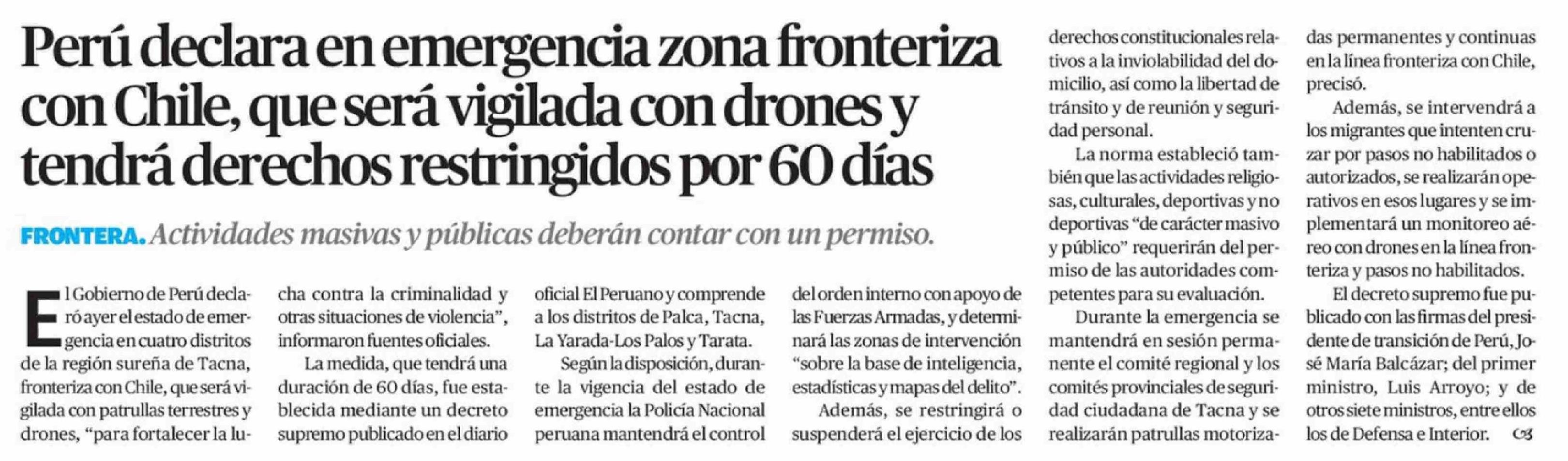 Título: Perú declara en emergencia zona fronteriza con Chile, que será vigilada con drones y tendrá derechos restringidos por 60 días