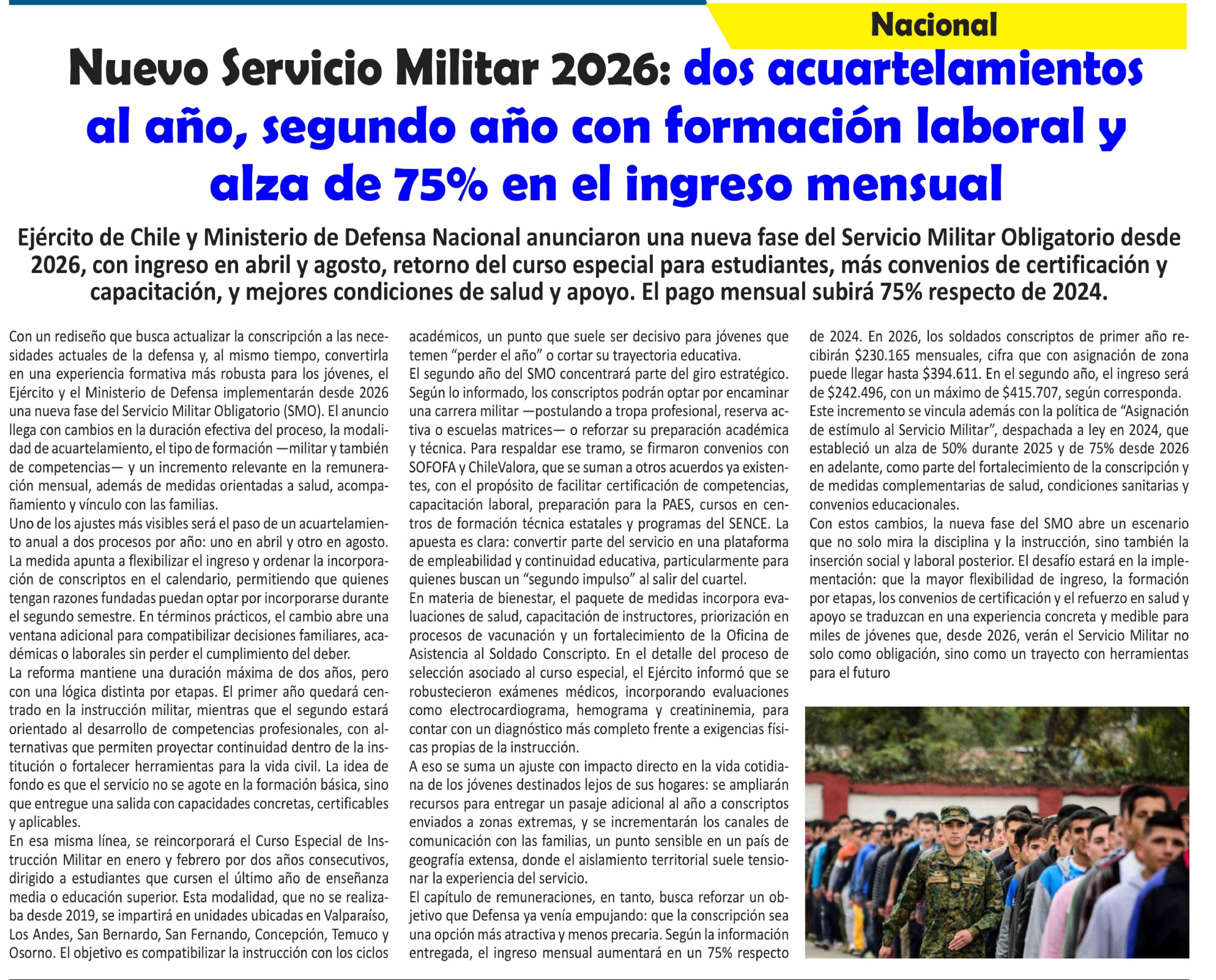 Título: Nuevo Servicio Militar 2026: dos acuartelamientos al año, segundo año con formación laboral y alza de 75% en el ingreso mensual
