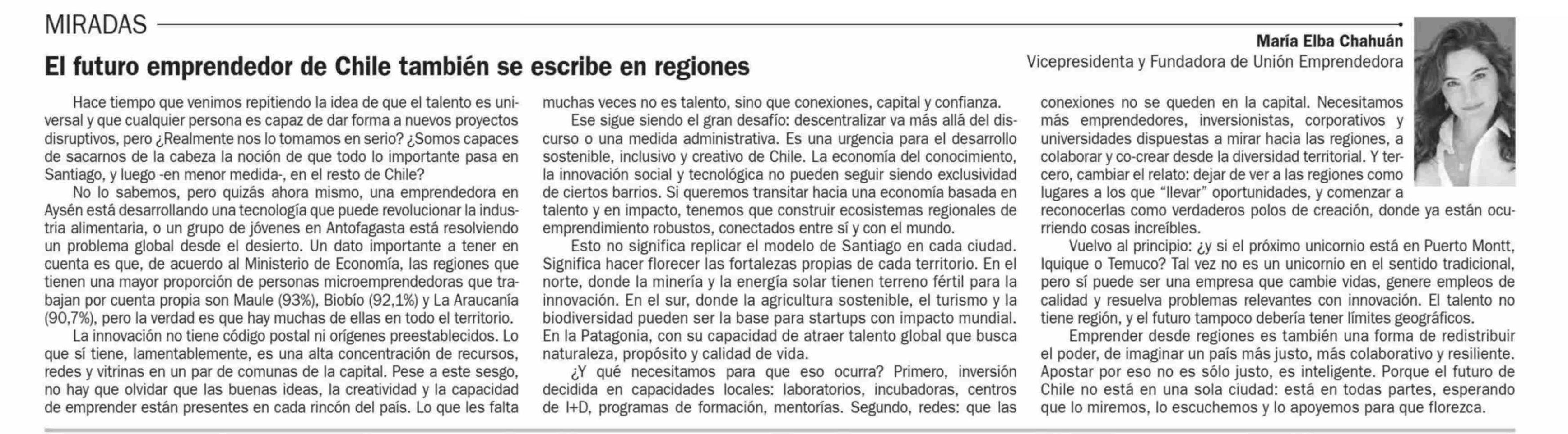 Título: COLUMNAS DE OPINIÓN: El futuro emprendedor de Chile también se escribe en regiones