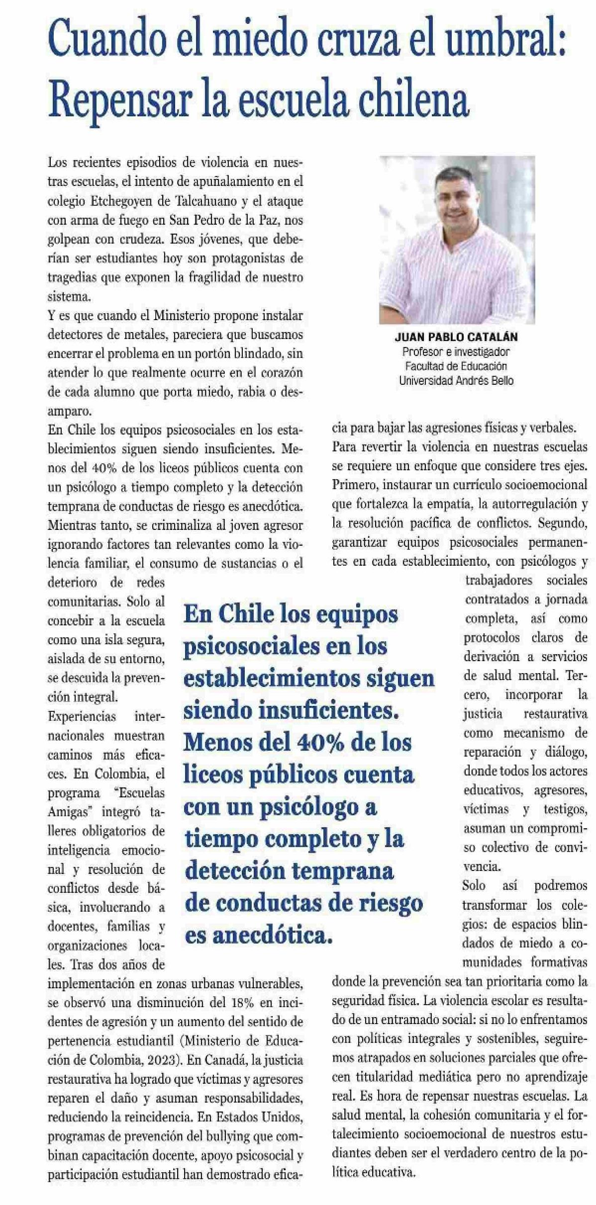 COLUMNAS DE OPINIÓN: Cuando el miedo cruza el umbral: Repensar la escuela chilena 19-06-2025 La Prensa de Curicó |