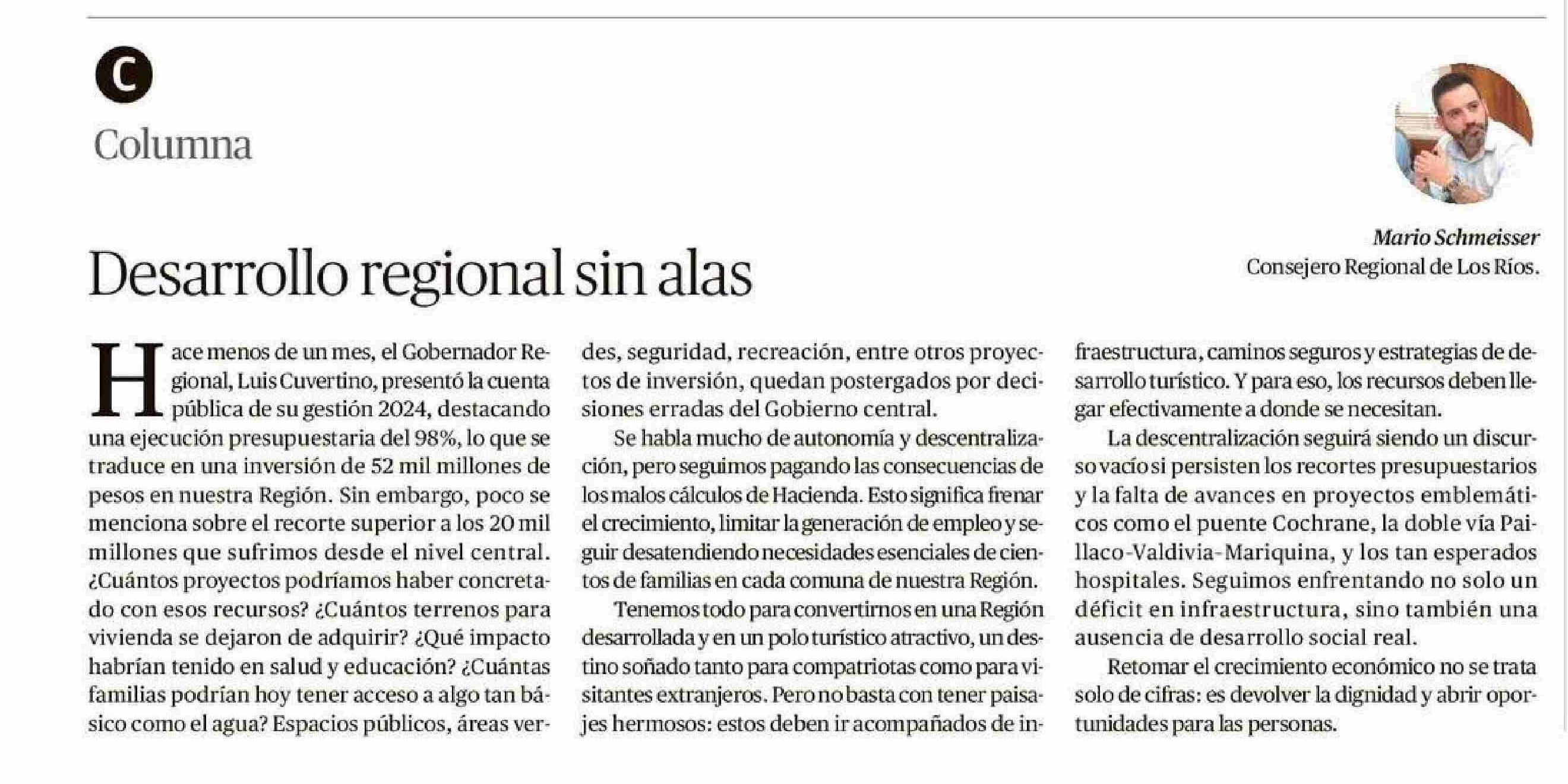 COLUMNAS DE OPINIÓN: Desarrollo regional sin alas 18-06-2025 Diario Austral Región de Los Ríos |