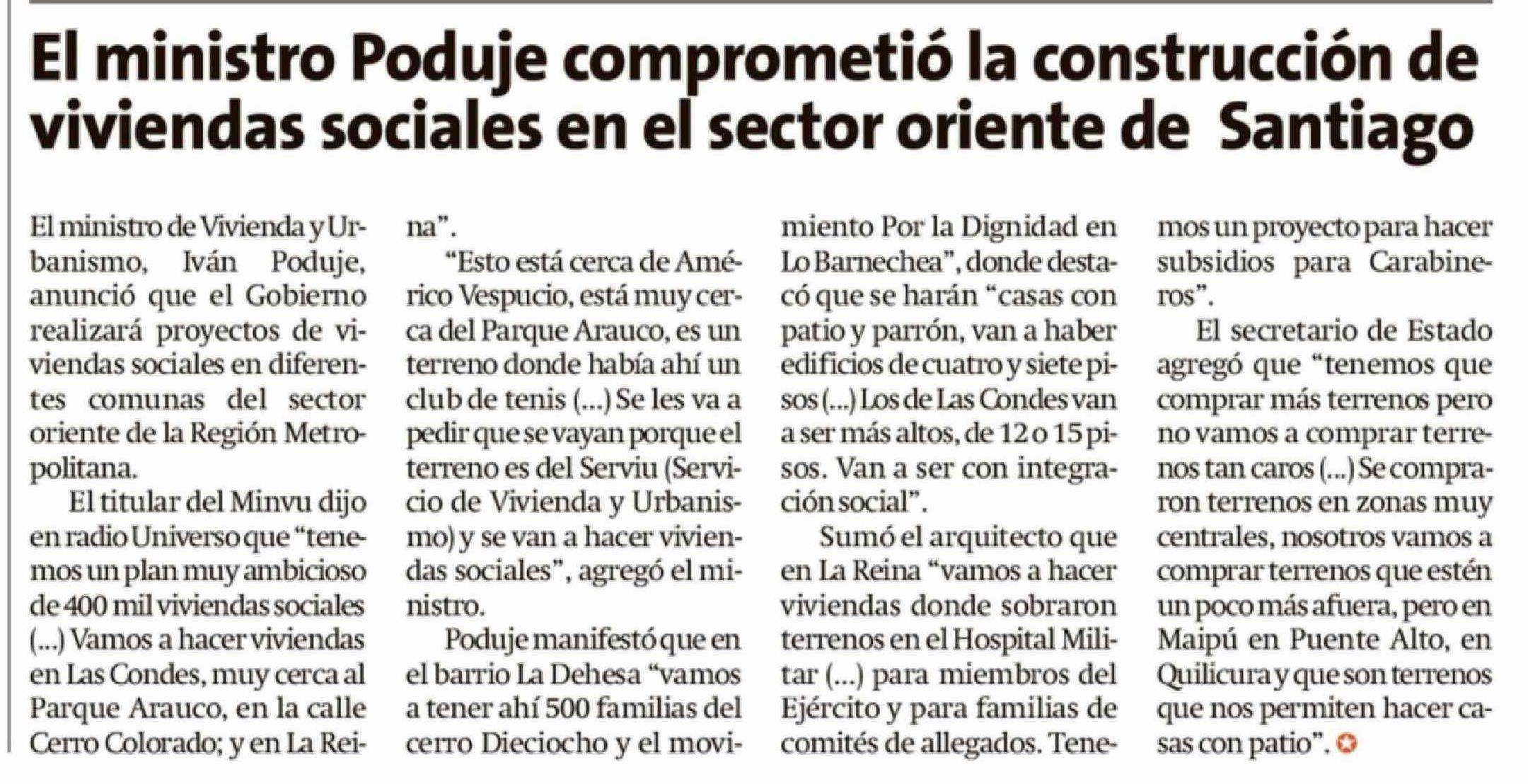 | Título: | El ministro Poduje comprometió la construcción de viviendas sociales en el sector oriente de Santiago |