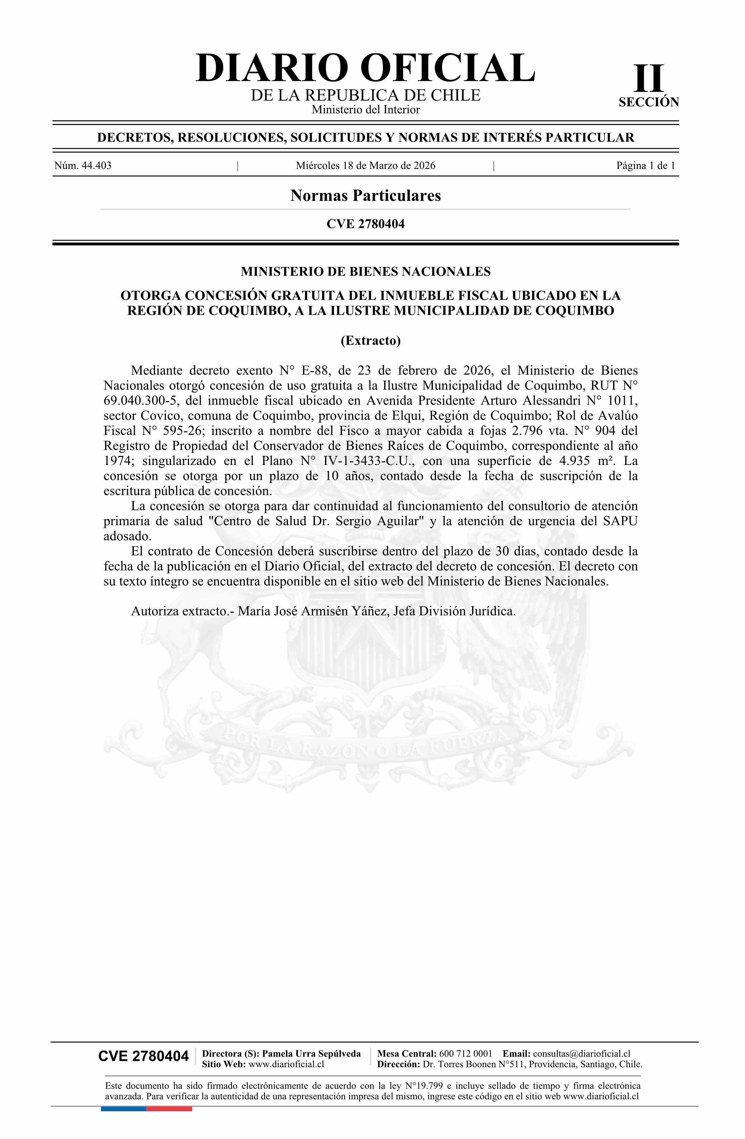 | Título: | Extracto de decreto exento número E-88, de 2026.- Otorga concesión gratuita de inmueble fiscal ubicado en la Región de Coquimbo, a la Municipalidad de Coquimbo |
