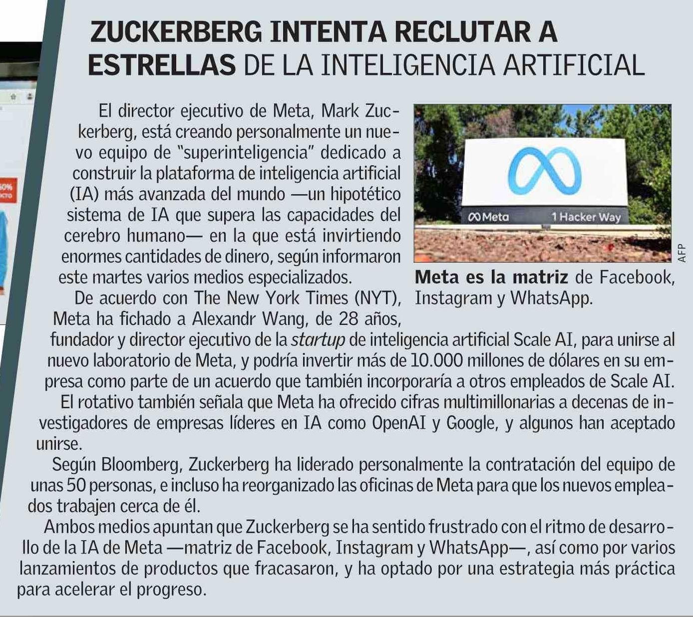 ZUCKERBERG INTENTA RECLUTAR A ESTRELLAS DE LA INTELIGENCIA ARTIFICIAL 11-06-2025 El Mercurio |