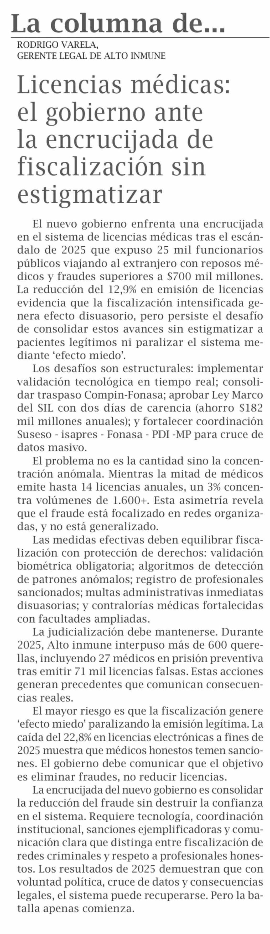 | Título: | Columnas de Opinión: Licencias médicas: el gobierno ante la encrucijada de fiscalización sin estigmatizar |