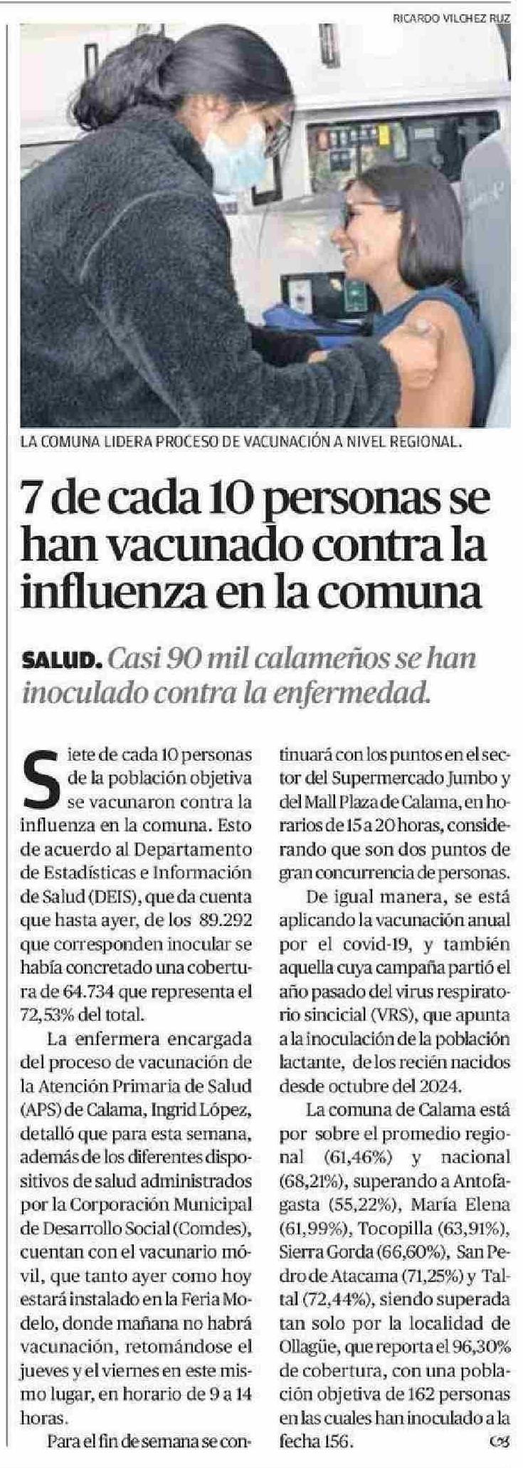 7 de cada 10 personas se han vacunado contra la influenza en la comuna 20-05-2025 El Mercurio de Calama |