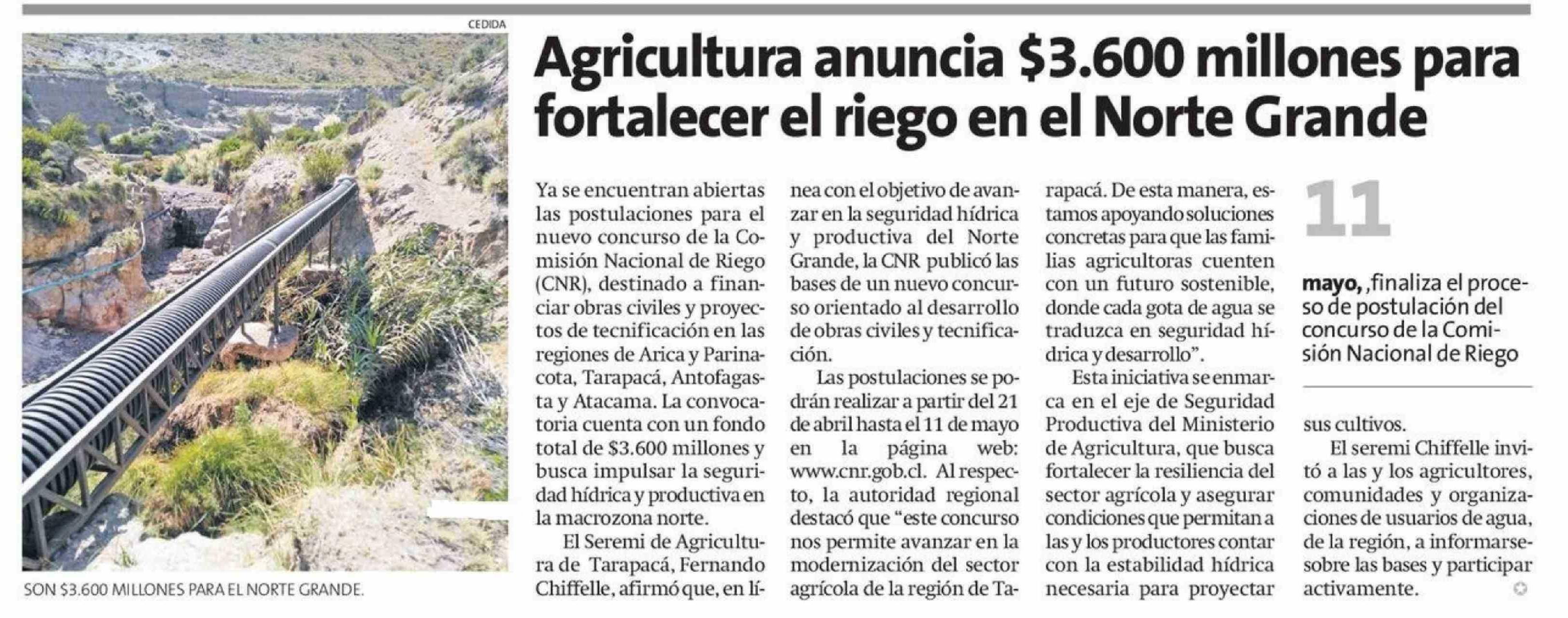 Agricultura anuncia $3.600 millones para fortalecer el riego en el Norte Grande 22-04-2026 La Estrella de Iquique |