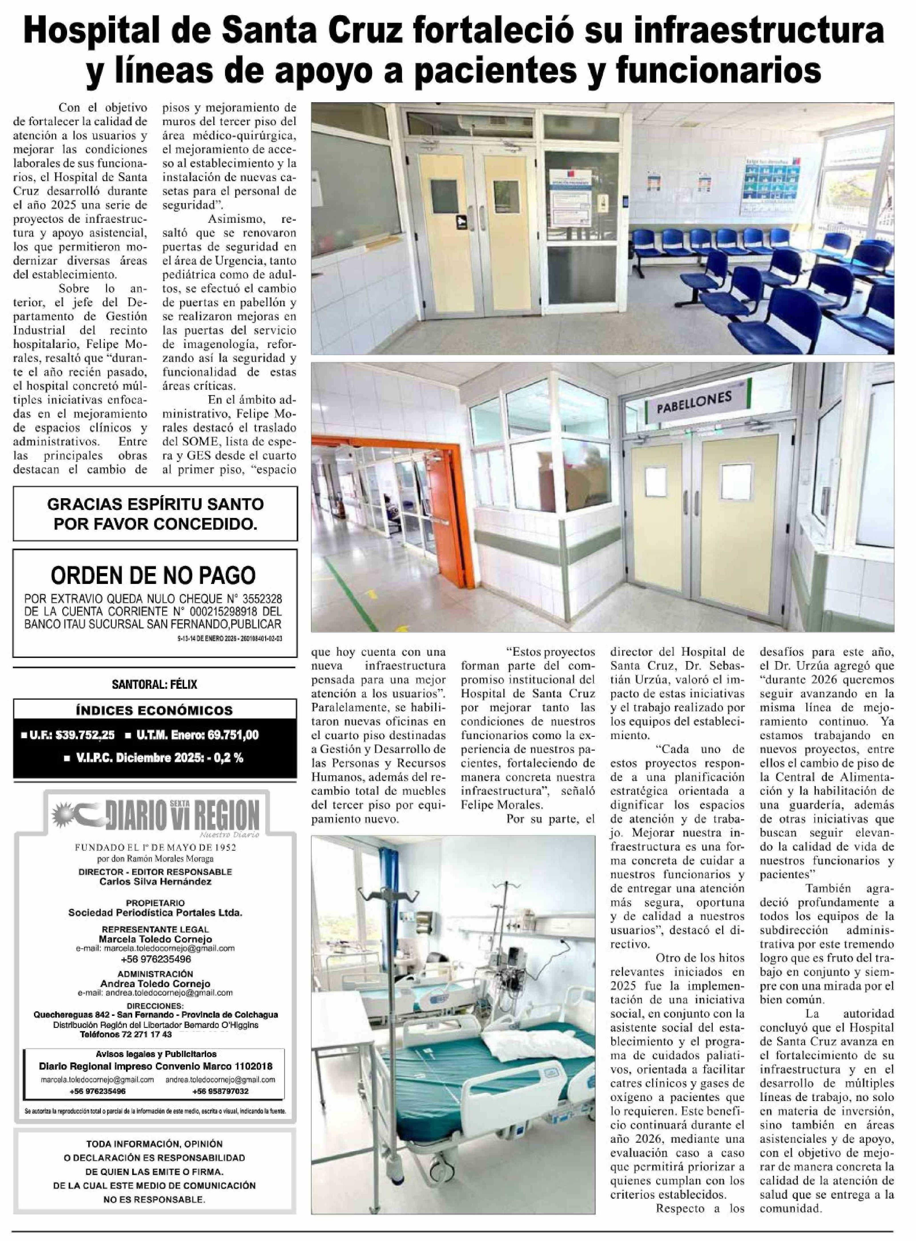 Hospital de Santa Cruz fortaleció su infraestructura y líneas de apoyo a pacientes y funcionarios 14-01-2026 Diario VI Región |