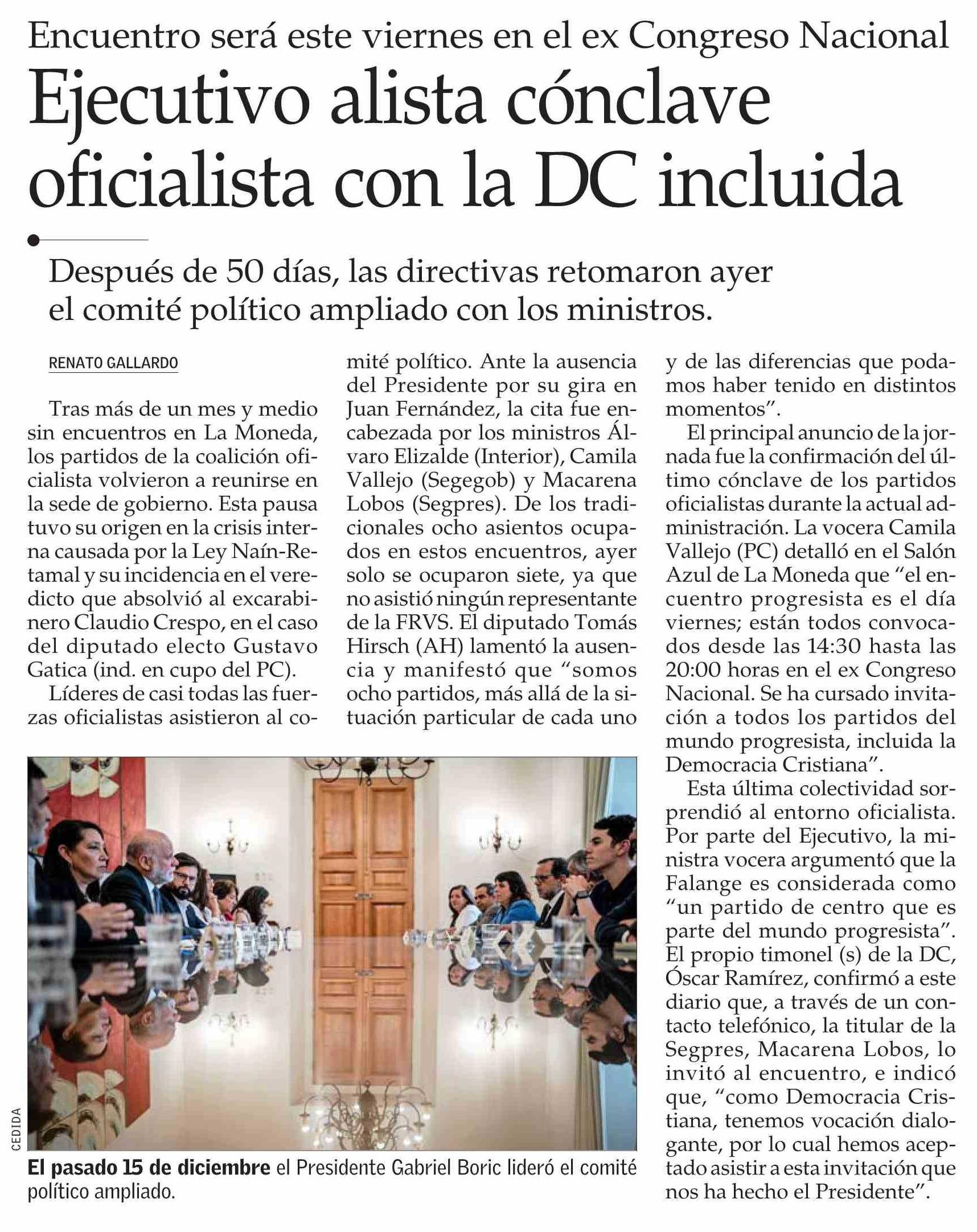 Ejecutivo alista cónclave oficialista con la DC incluida 03-03-2026 El Mercurio |