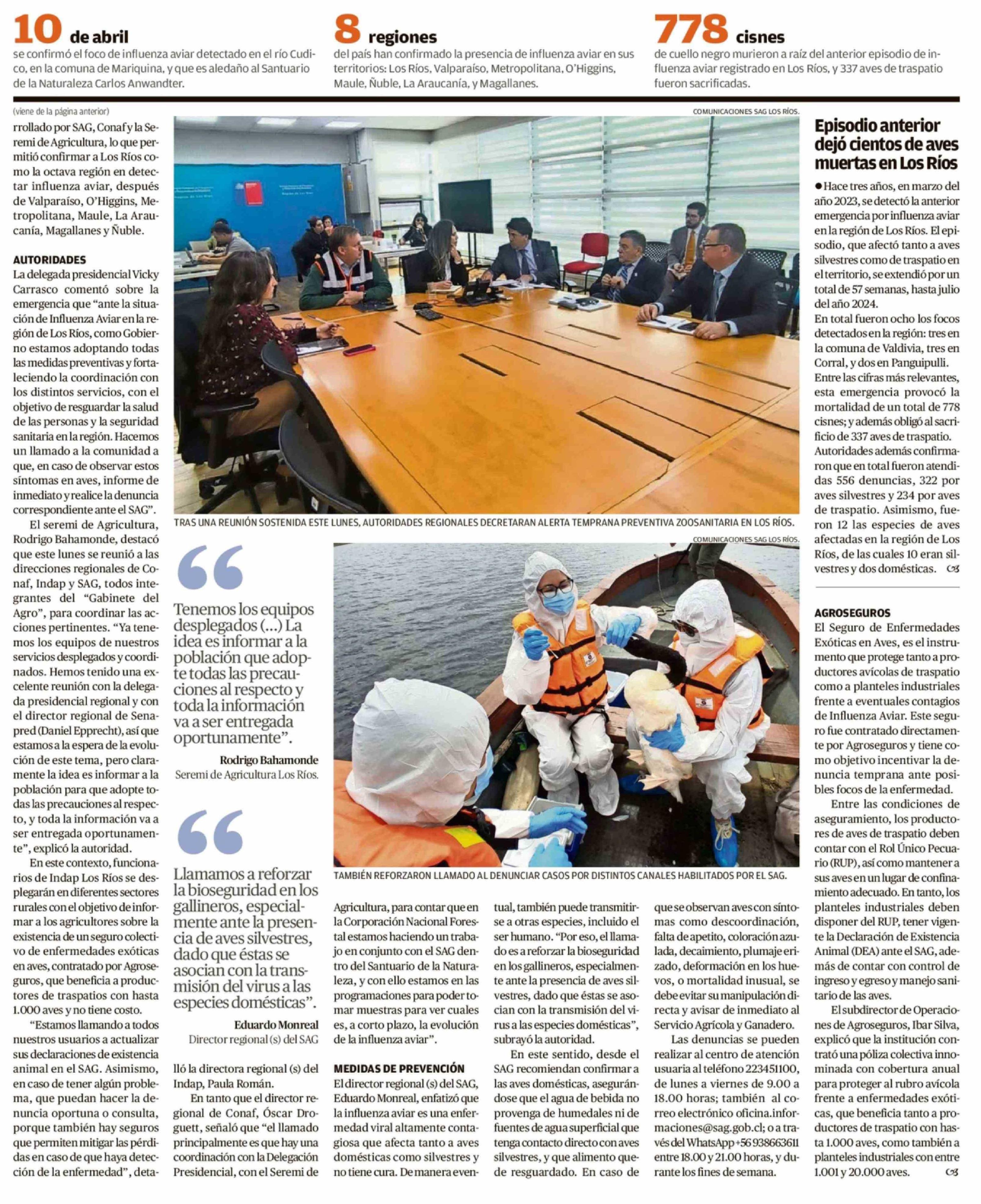 Refuerzan llamado a la prevención ante detección de influenza aviar 15-04-2026 Diario Austral Región de Los Ríos |