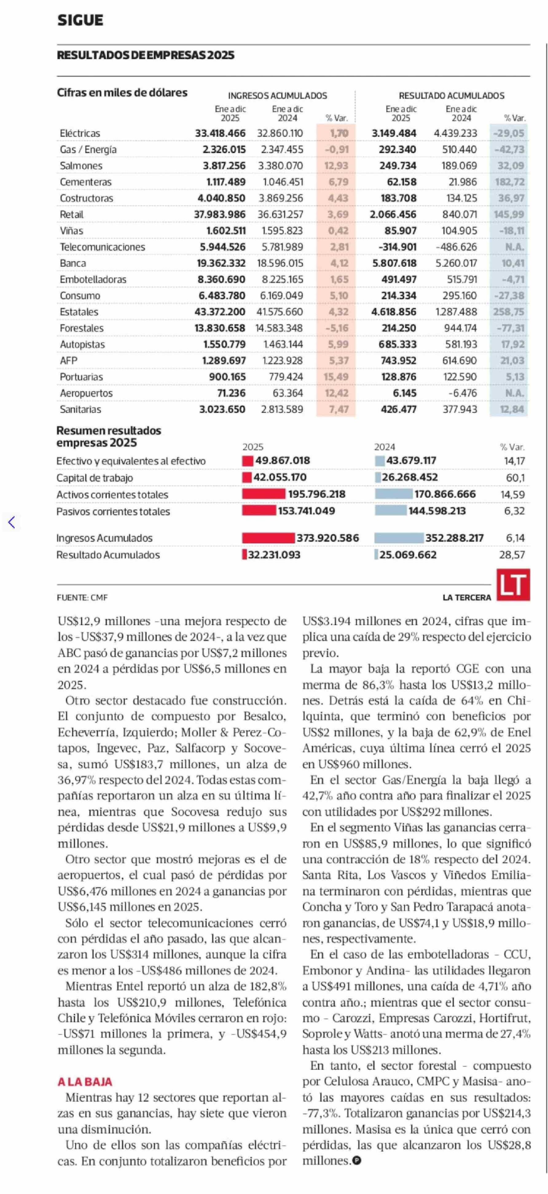 Empresas cierran 2025 con ganancias por más de US$32 mil millones y Codelco anota las mayores utilidades 02-04-2026 La Tercera |