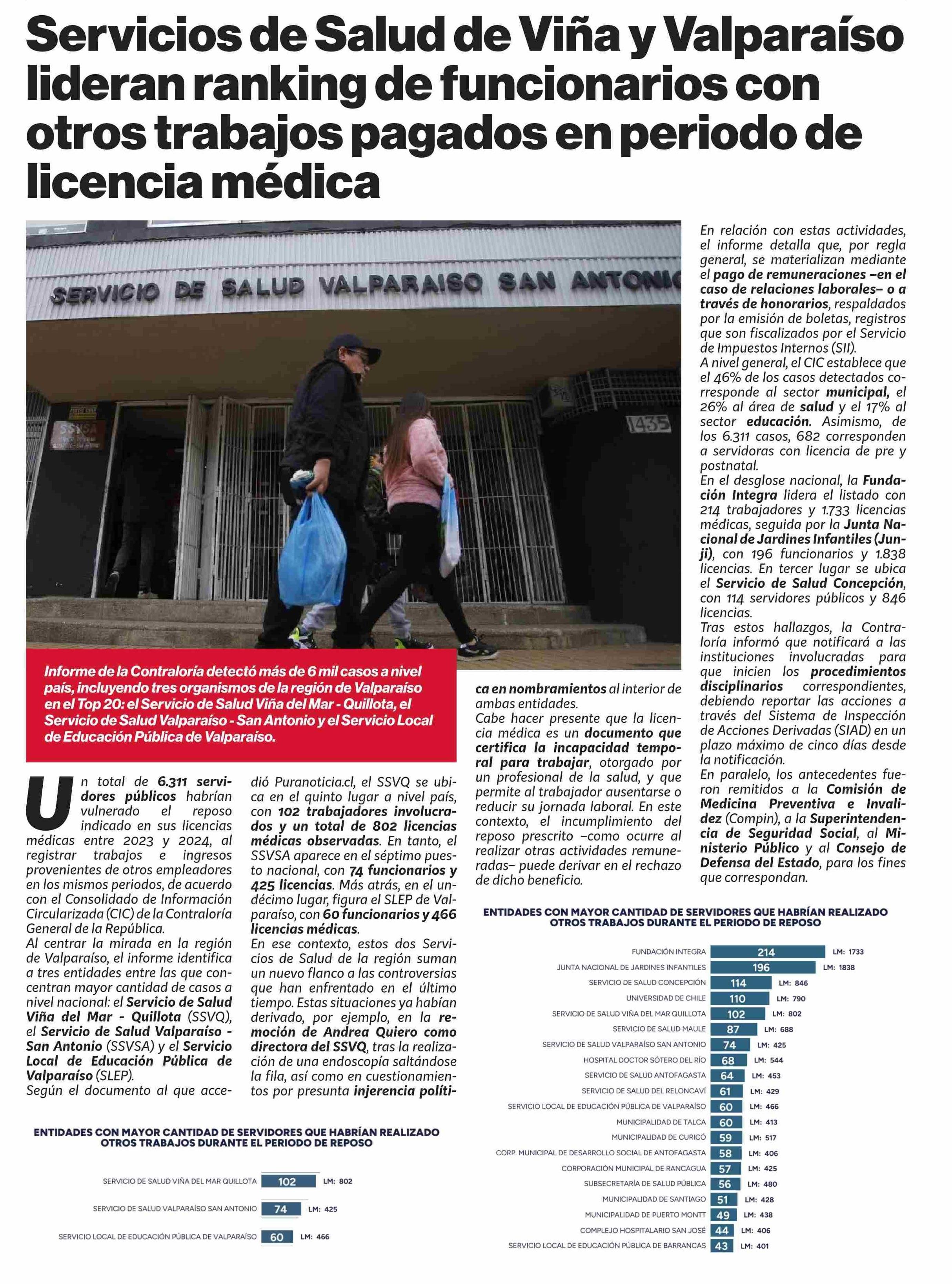 Título: Servicios de Salud de Viña y Valparaíso lideran ranking de funcionarios con otros trabajos pagados en periodo de licencia médica
