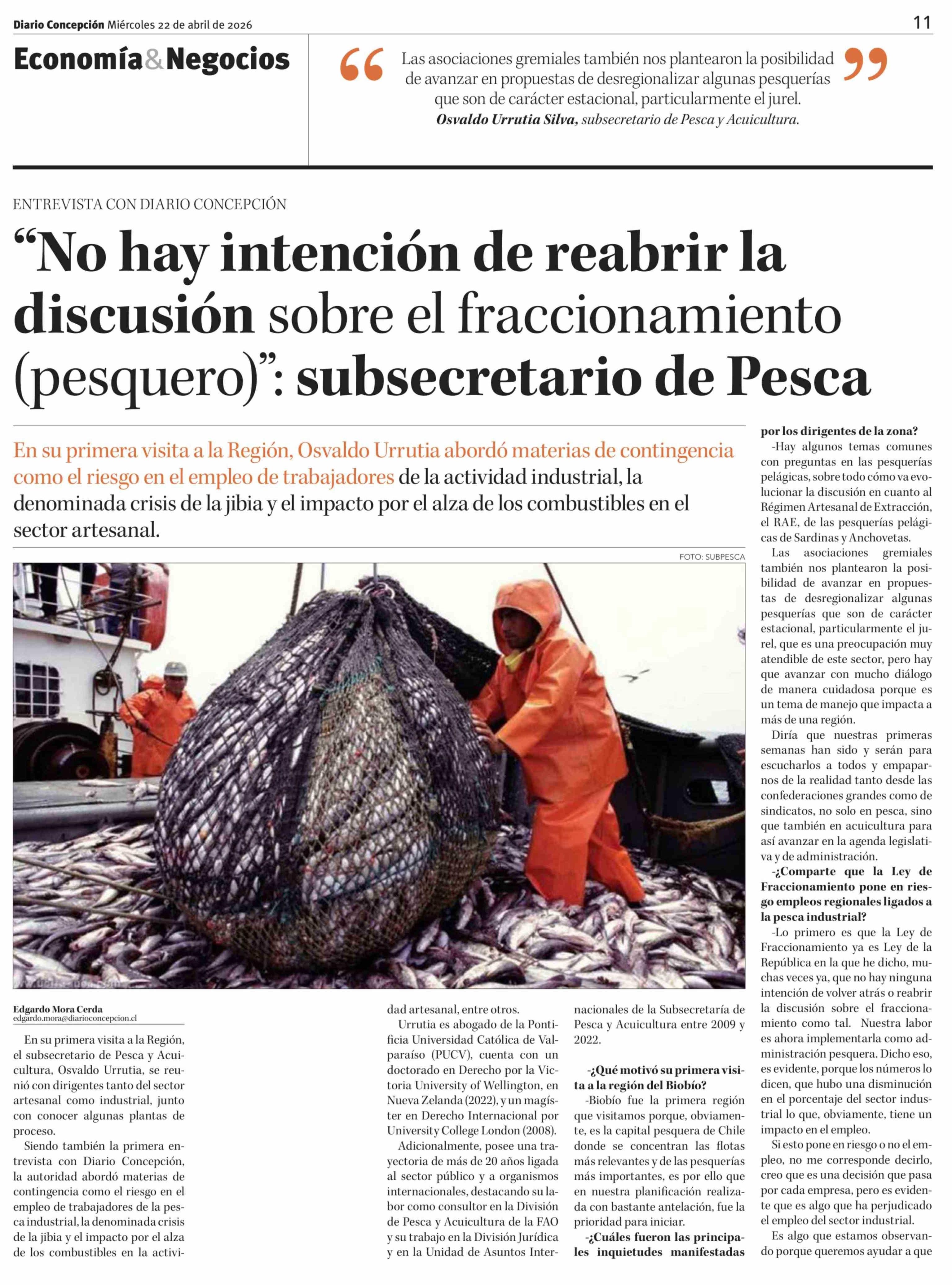 "No hay intención de reabrir la discusión sobre el fraccionamiento (pesquero)": subsecretario de Pesca 22-04-2026 Diario Concepción |