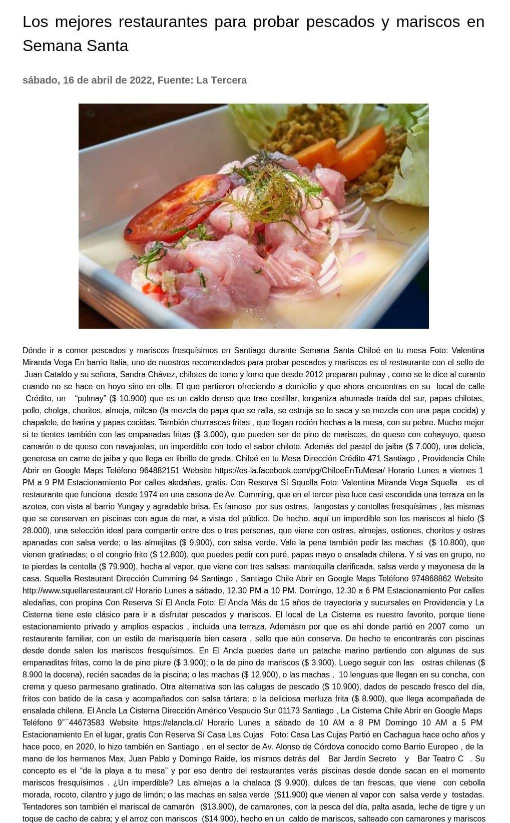 Los mejores restaurantes para probar pescados y mariscos en Semana Santa 16-04-2022 La Tercera.com (Stgo - Chile) |