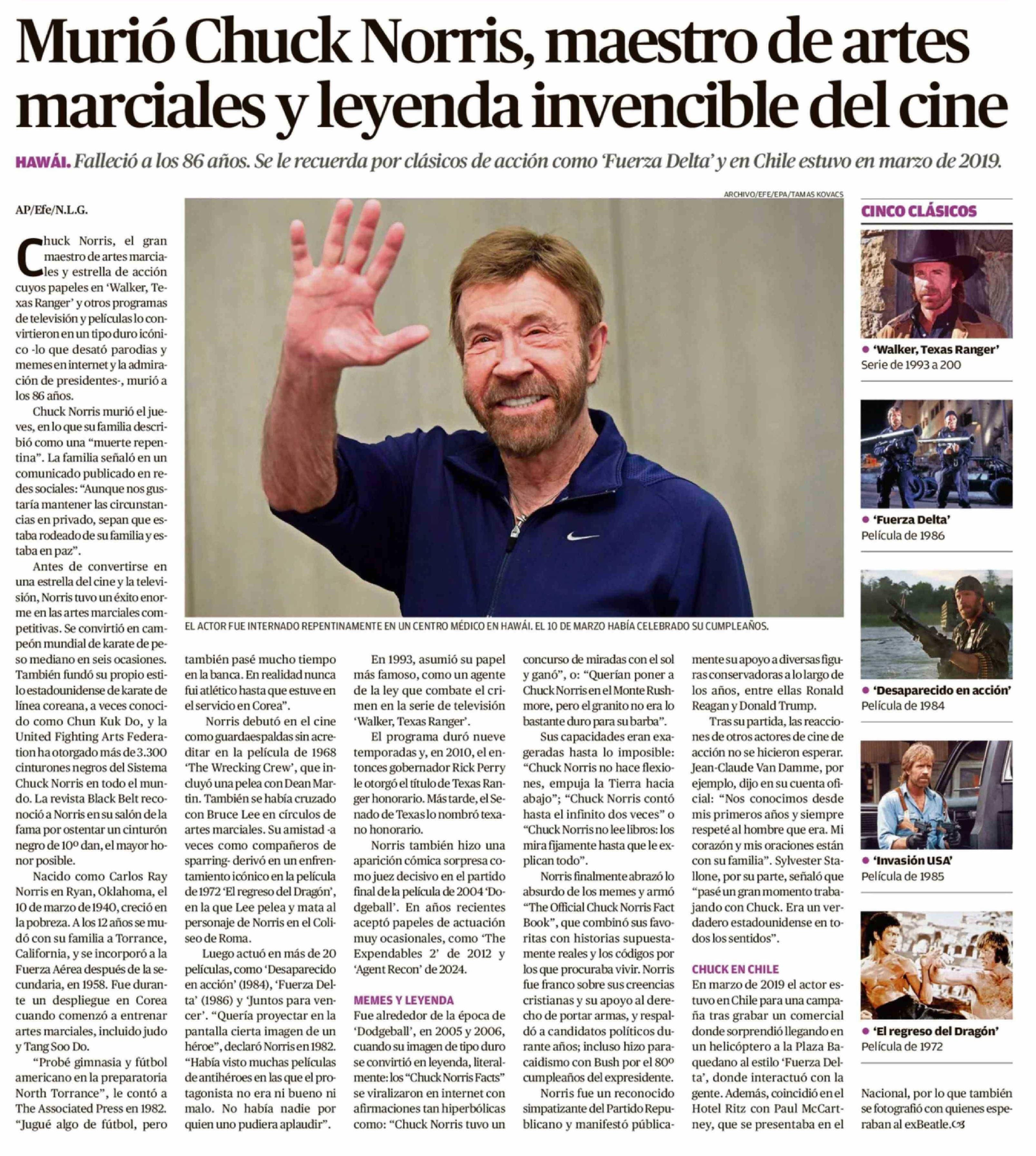 | Título: | Murió Chuck Norris, maestro de artes marciales y leyenda invencible del cine |