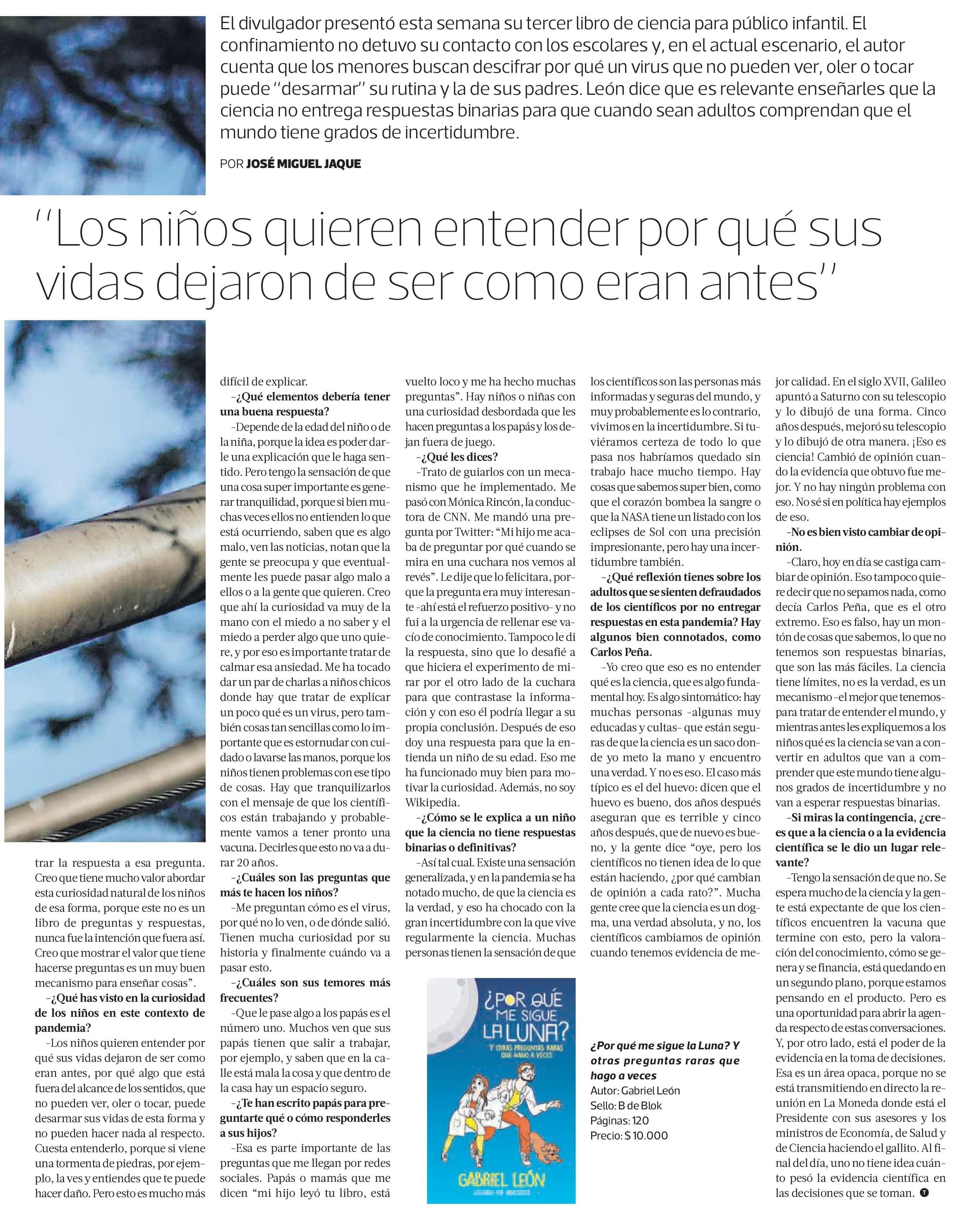 GABRIEL LEÓN “Los niños quieren entender por qué sus vidas dejaron de ser como eran antes” 11-07-2020 La Tercera |