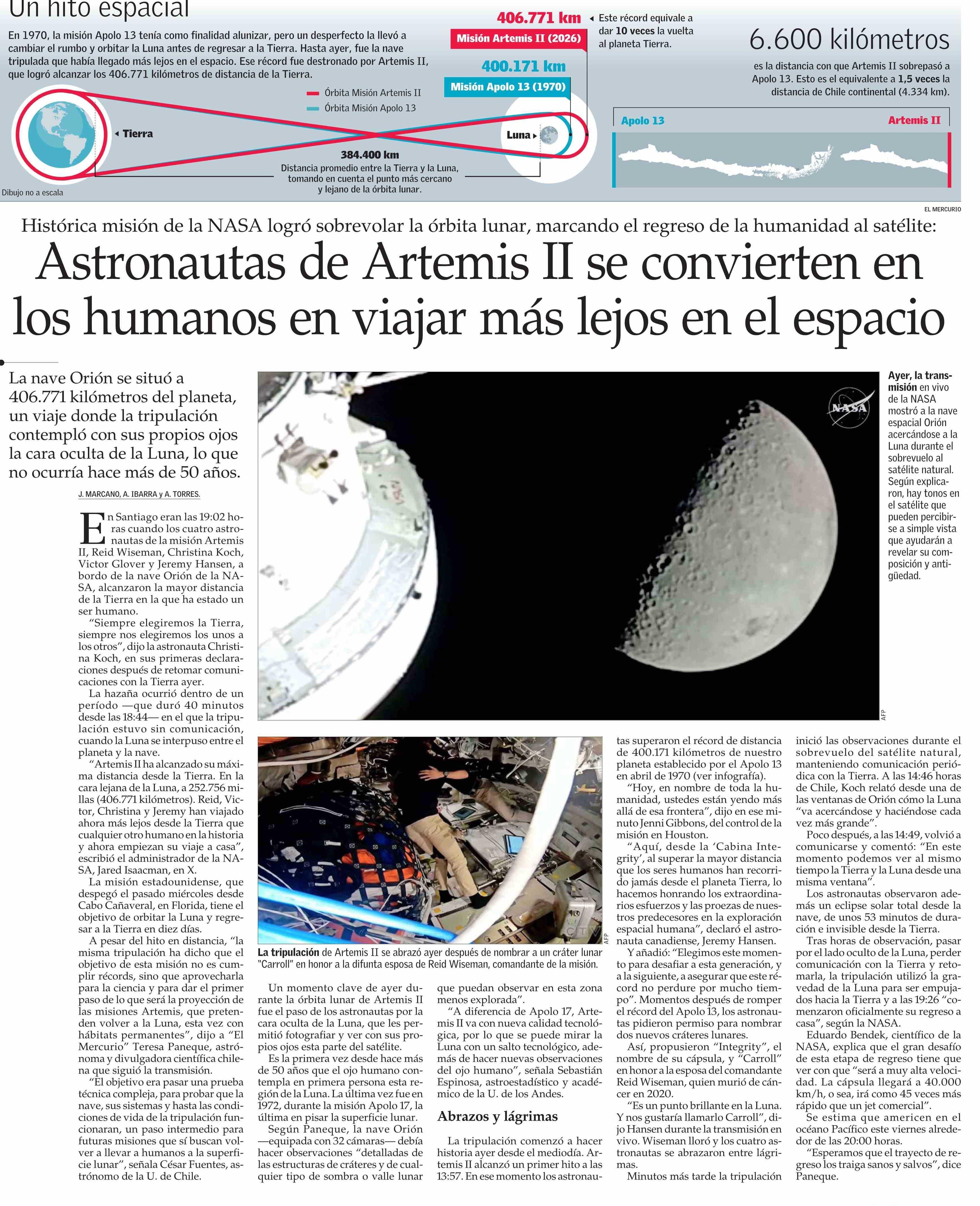 Astronautas de Artemis II se convierten en los humanos en viajar más lejos en el espacio 07-04-2026 El Mercurio |