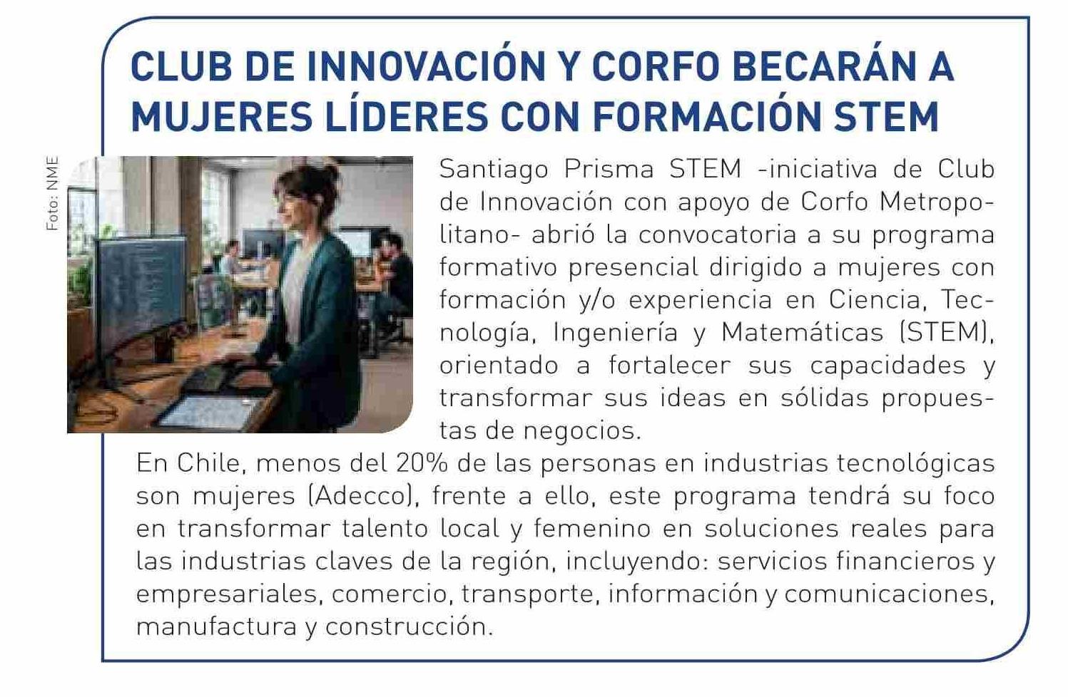 | Título: | CLUB DE INNOVACIÓN Y CORFO BECARÁN A MUJERES LIDERES CON FORMACIÓN STEM |