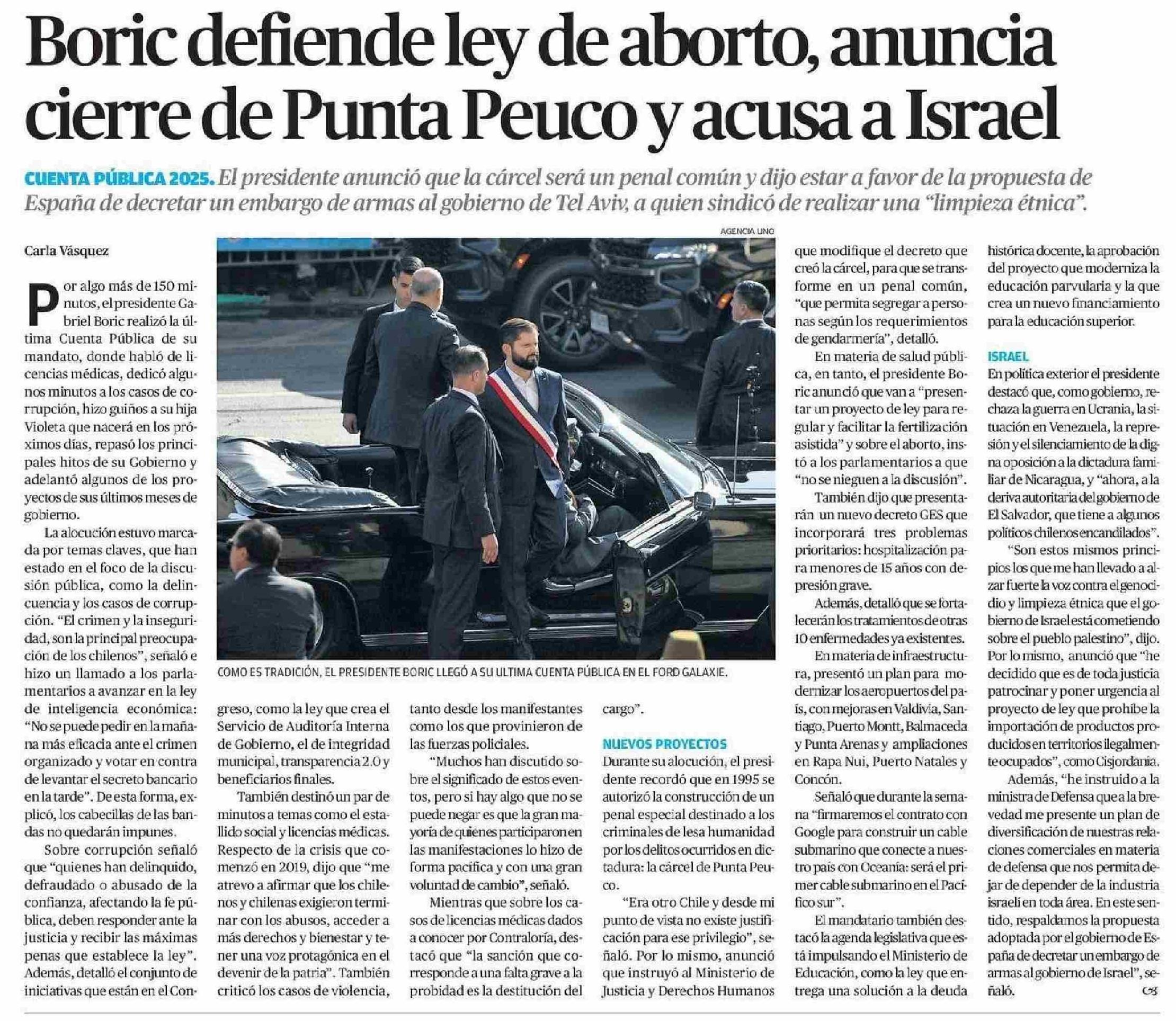 Boric defiende ley de aborto, anuncia cierre de Punta Peuco y acusa a Israel 02-06-2025 El Mercurio de Antofagasta |