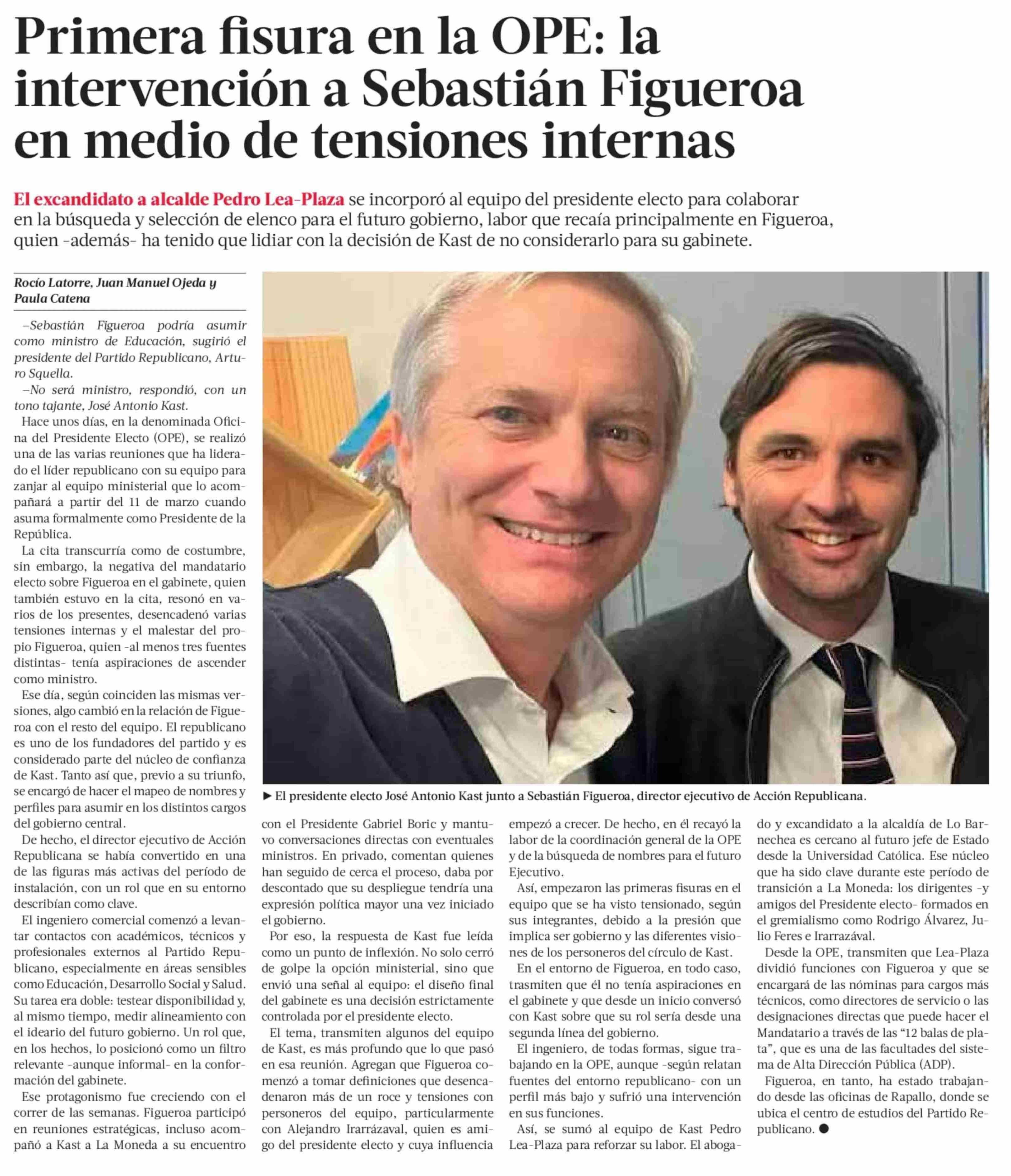 Primera fisura en la OPE: la intervención a Sebastián Figueroa en medio de tensiones internas 07-01-2026 La Tercera |